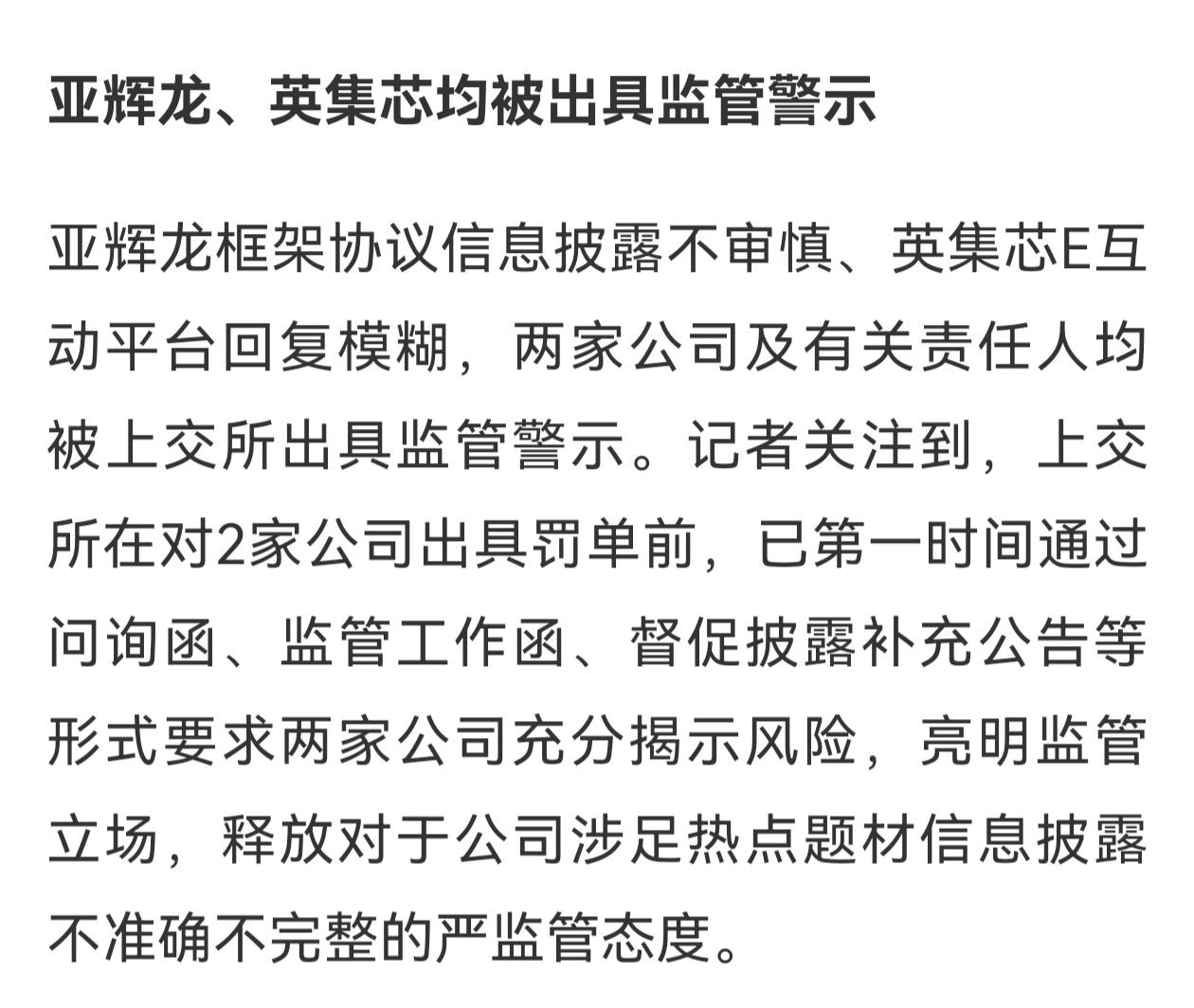 监管及时出手,脑机接口热门股亚辉龙、英集芯被出具监管警示,事关亚辉龙信息披露不审慎,英集芯E互动平台回复模糊。 脑机接口题材近期爆火,市场情绪处于亢奋状态,只要沾一点边就大幅上涨,这时候有的公司及时披露信息,提示存在风险,有的公司却有意擦边,借势推动股价上涨。这时候监管及时出手,对违规公司开出罚单,释放了对热点题材信批严管的态度,有利于信息披露的真实、完整、准确,避免对投资者的误导。 热点题材的炒作,是A股常有的事,投资者还是要主动甄别题材真伪,以免成为游资接盘的工具。一些题材股没有业务支撑,但情绪市场往往说你有你就有,游资炒作之后往往一地鸡毛,不少追涨的人没有吃到肉反惹一身骚。