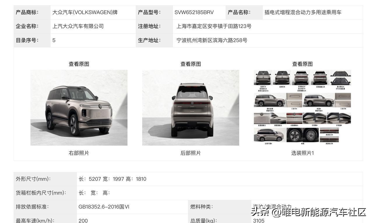 增程动力的大众ID. ERA 9X工信部申报[思考]官方在证件照公布的一瞬间就把官图释放了[捂脸] 车身尺寸5207×1997×1810mm,轴距3070mm,六座布局[思考] 电池容量51.1/65.2kWh,纯电续航里程267/321/340km[思考]
