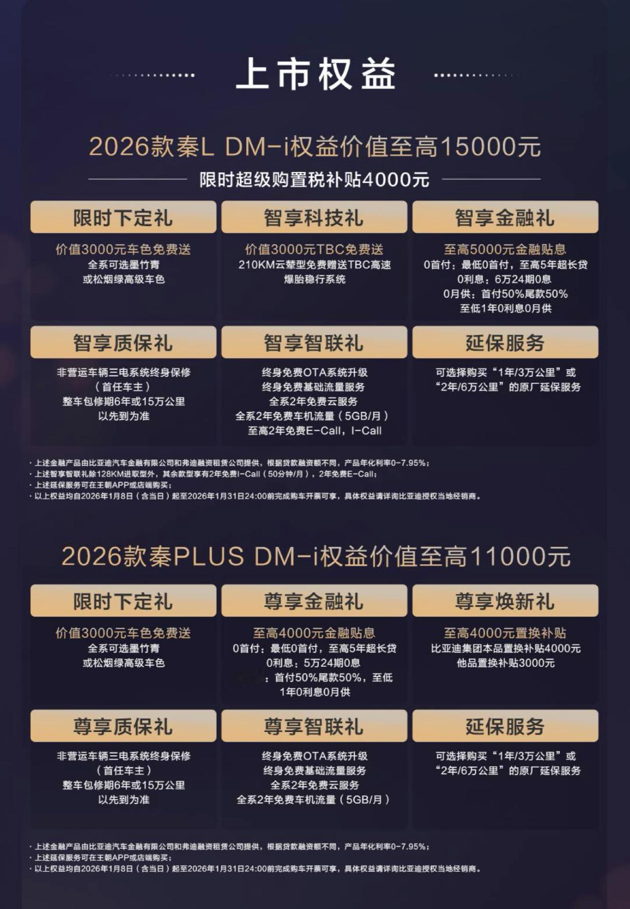 今春秦plus2026版与前两年荣耀版与冠军版思路一脉相承,如出一辙,依然是增配版。7.98实卖不限量供应,最低版本赫然在列依然有6气囊,4雷达,倒车摄像头,自动驻车,车身稳定,防抱死,自动驻车,上坡辅助,前后防撞梁,车机系统与常用配置等也一应俱全。低配价格香就成,高配版辅助驾驶与加大电池。
