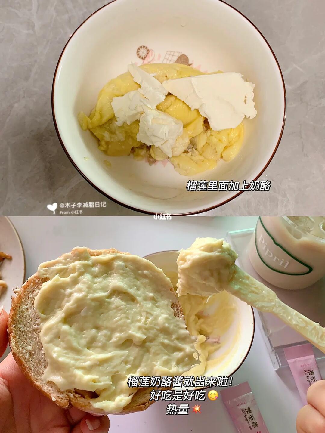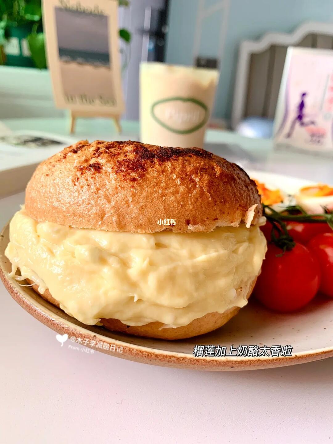 一大早就开始炫榴莲[派对R]~奶酪➕榴莲这是什么吃法?好吃😭又奶又甜!夹贝果里吃太满足啦!还爆浆~除了热量💥味道超👍🏻!