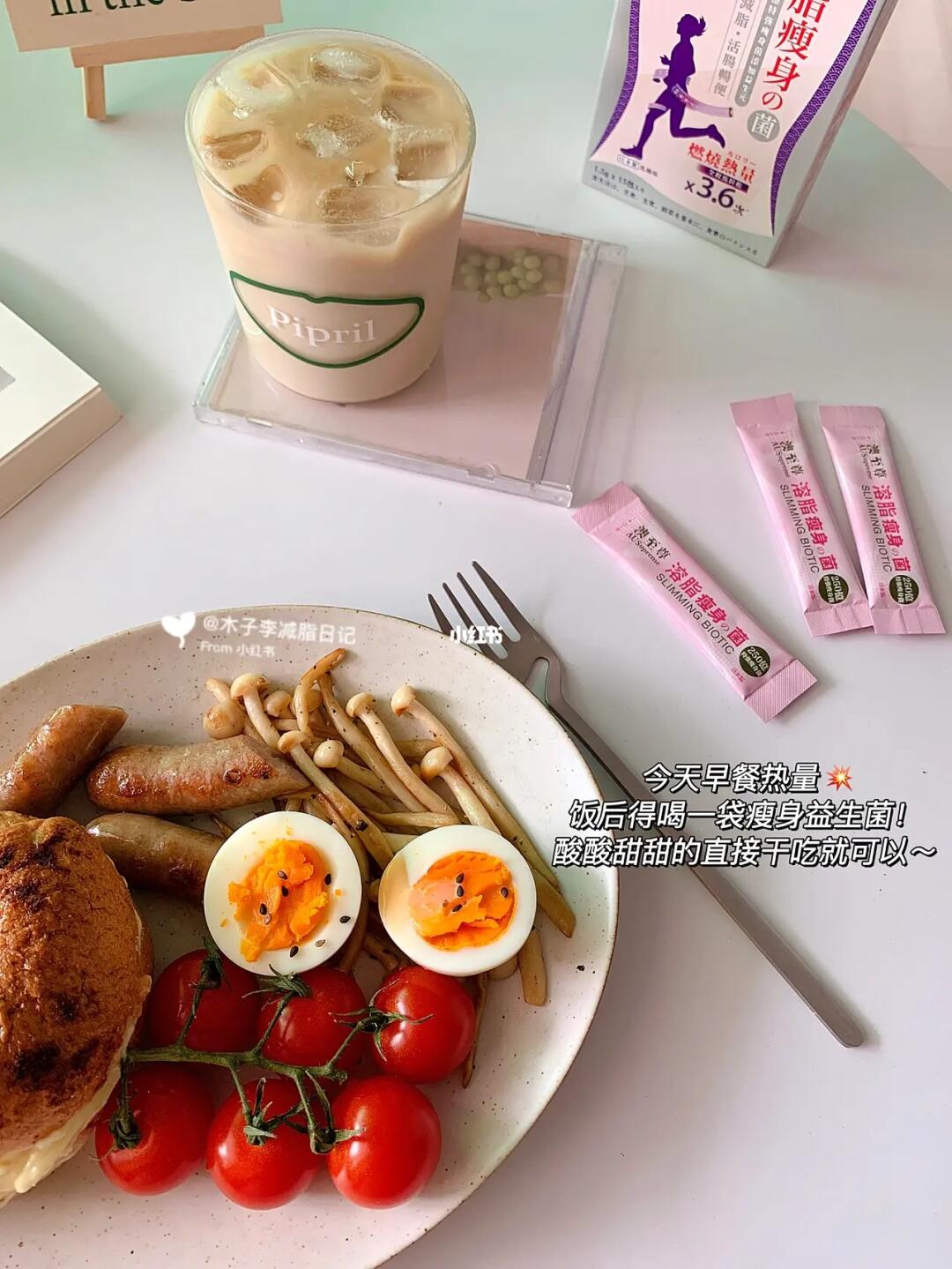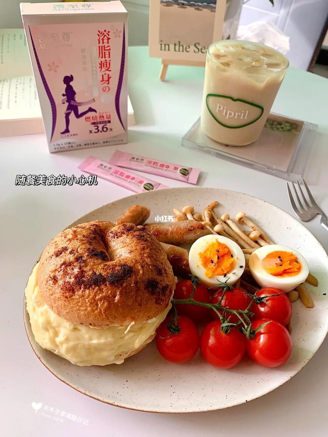 ☀️早餐:鸡蛋🥚|西红柿|贝果|榴莲奶酪酱|煎海鲜菇|煎肉肠|冰拿铁|瘦身益生菌