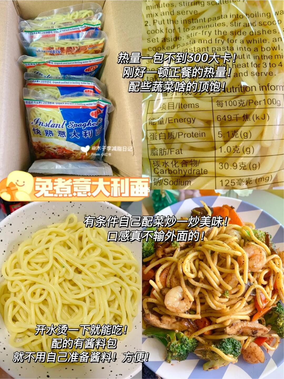即食免煮开水泡2分钟加上酱料即可吃了!懒人必备了~常温即可保存宿舍减脂福音呀!面条筋道有嚼劲😋我喜欢配菜炒着吃特美味!低卡低脂减脂期大口吃意面🍝!