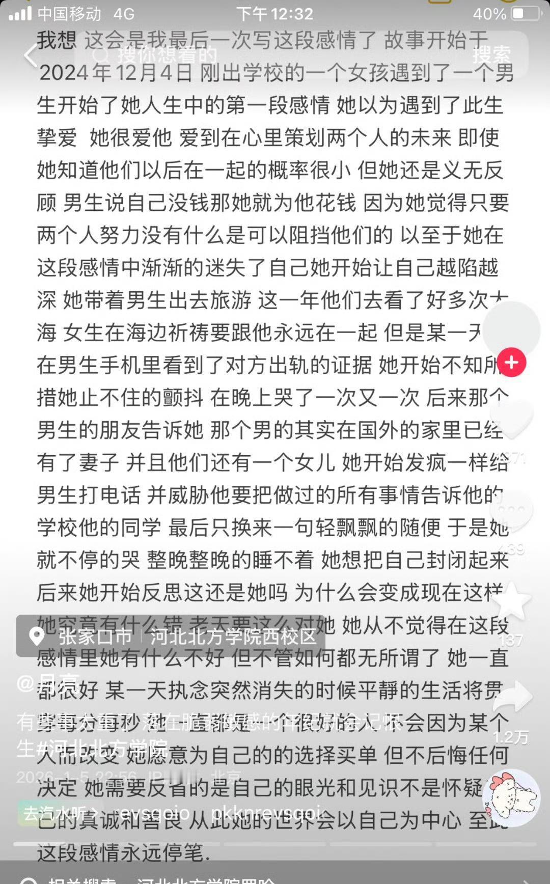 一个刚出校园的女生控诉,被巴基斯坦渣男骗钱骗感情。他们在2024年底相识相爱,女生被巴基斯坦男生的甜言蜜语俘获,以为这就是真爱。为他花钱,带他出去旅游,两人度过了一段浪漫的时光。偶然间,发现巴基斯坦人手机上的真相。原来他在巴基斯坦已婚,还有一个女儿。却在女生面前装单纯大男孩,骗女生的感情。女生看了伪装的巴基斯坦渣男,简直要崩溃,她全心全意的付出,却是赤裸裸的欺骗。 骗感情经历