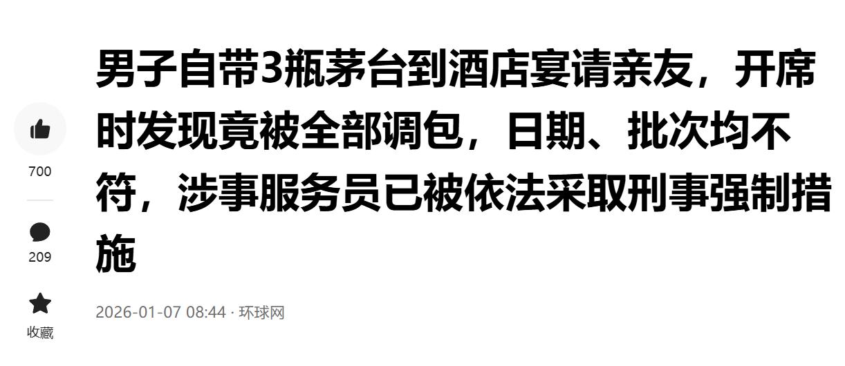“丢人丢大发了!”近日,上海,男子为宴请朋友,自己带了三瓶高端酒前往某餐馆,开席前核对细节时竟发现酒被调了包,瓶身信息与记忆中完全不符,于是立马报警,警方调查后发现真酒已被服务员用网购的廉价假酒替换,每瓶假酒成本仅两三百元。网友:好一招“狸猫换太子”! 事情的起因,是一场精心准备的朋友酒局,一位王姓先生,为了好好招待朋友,特意把家里珍藏的三瓶高端白酒找了出来,亲自带到了提前预订的餐馆,毕竟是拿得出手的硬通货,王先生也格外稳妥,刚进包间,就把这三瓶压箱底的好酒放在了自己主位的脚边,紧挨着座椅,按说这个距离,就在自己眼皮子底下,该是最放心的了,总不至于出什么岔子。 之后朋友陆陆续续到齐,大伙儿忙着寒暄聊天,服务员则穿梭其间上菜,前前后后大概过了半个小时,这期间一切都显得平平常常,没人察觉到有什么不对劲的地方。直到开席前,王先生伸手去拿脚边的酒,准备给朋友们斟上的时候意外出现了。 刚碰到酒瓶王先生就觉得手感有点不对,再定睛一看视觉上也透着股违和感,心里瞬间“咯噔”一下沉了下去,他赶紧把酒瓶拿到灯光下仔细端详,重点看了看瓶身上的生产日期——这一看更不对劲了,上面的信息跟自己脑子里记的完全对不上,怎么想都觉得糊涂,这种直觉来得突然,却异常精准,王先生没敢急着开瓶,而是立刻掏出手机,对着瓶身的防伪码扫了过去。 扫码的结果印证了他的猜测:防伪码根本扫不出正确信息,显示的内容跟这瓶高端酒完全“牛头不对马嘴”,看到结果的那一刻,王先生脑子里瞬间闪过一个画面,刚才服务员上菜的时候,有个服务员在他身边的动静格外勤快,当时没在意,现在想来,那勤快里透着点不自然。 意识到酒被调包了,王先生没敢声张,当即就报了警,警方介入后第一时间调取了餐馆的公共视频,顺着视频线索一查,就像剥洋葱一样,把那半个小时里发生的隐秘事儿全还原了出来。 原来那个服务员早在王先生他们点菜、说自带酒水的时候,眼神就一直在那三瓶高端酒上打转。客人说“先不点酒,不够再说”的话,不仅没让他收敛,反而给了他下手的信号。 在贪念的驱使下,这个服务员就借着上菜的名义当掩护,在王先生身边看似无意地弯腰、起身,再弯腰,每一次看似殷勤的服务动作背后,其实都在偷偷推进“狸猫换太子”的计划,视频里看得明明白白,他来来回回跑了三趟,就趁着大家聊天分心的功夫,把王先生脚边的三瓶真酒悄悄换走了。 被换走的真酒,早就被他转移到了停在店外的电瓶车上,而留在餐桌下的,是三瓶包装跟真酒几乎一模一样的假酒,后续调查还揭露,这些用来顶包的赝品,都是这个服务员从网上淘来的高仿货,里面灌的是廉价劣质酒水,每瓶的成本撑死了也就两三百块钱,用两三百的假货,换走价值不菲的高端真酒,这算盘打得也太精了。 这事儿被曝光后,围观的网友都直呼“好险”,要知道这就是一场专门利用消费者疏忽心理的博弈,平时大家自带酒水去餐馆,开席后推杯换盏,很少有人会再仔细核对瓶身细节,尤其是这种高仿外包装,或者用原瓶回收灌装的假酒,普通人用肉眼根本难辨真伪。 这次要是换成别人,对自己带的酒没那么熟悉,开席前也没多留个心眼核对生产日期和防伪码,那后果真不堪设想,三瓶廉价劣质酒精,不光能骗过在场所有人的舌头,让大家喝着假酒还以为是好酒,等散席后王先生发现真相,损失的可就不只是几瓶酒的钱了,精心组局请客,最后用假酒招待朋友,传出去不光自己丢人,还得让朋友觉得不被尊重,名誉和情谊都得受影响。 目前那个手脚不干净的服务员已经被警方抓获,等待他的必然是法律的制裁,但这场差点就得逞的“偷梁换柱”,也着实给喜欢自带酒水去餐馆的食客们提了个醒,不管是去餐馆吃饭,还是去其他场合,自带贵重物品的时候,真得时刻多留个心眼,别因为分心就给坏人可乘之机,毕竟小心驶得万年船,尤其是这种关乎面子和损失的事儿,多一分谨慎,就能少一分风险,避免出现“丢人丢大发了”的尴尬局面。 (信息来源:《男子自带3瓶