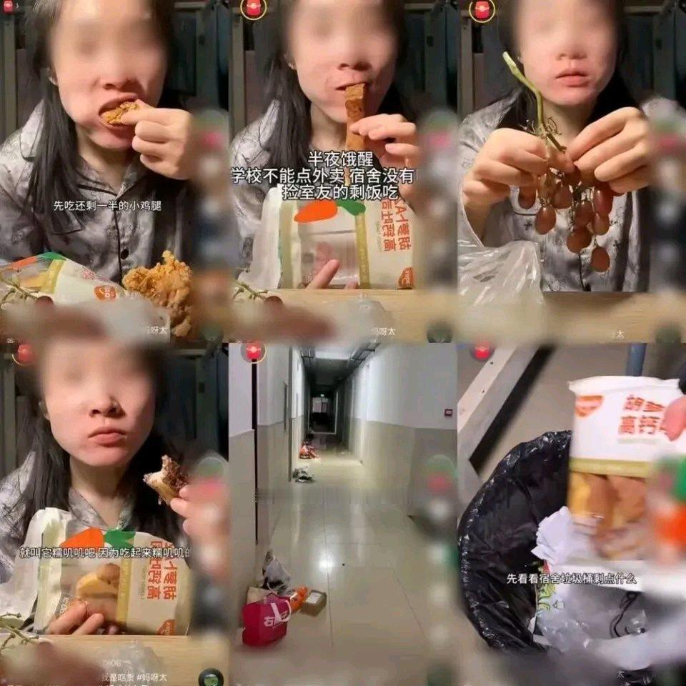 现在的吃播真是越来越没下限了!那个有35万粉丝、获赞超600万的“快快超快乐”,打着“在校女大学生”人设,竟在垃圾桶翻剩饭吃。一会儿从宿舍垃圾桶捡面包片和番茄酱,一会儿又在过道捡别人吃剩的炸鸡腿、鸡叉骨和葡萄,然后全吃下去,看得人直犯恶心。 之前她的视频就很猎奇,像一次性吃三斤韭菜、醋泡蔬菜等,还被质疑身份造假、内容摆拍。这种畸形吃播就是想靠“审丑”博流量、变现。好在最后账号被多平台封禁,视频也下架了。平台真该当好“守门人”,别再让这种低俗内容污染网络环境了。
