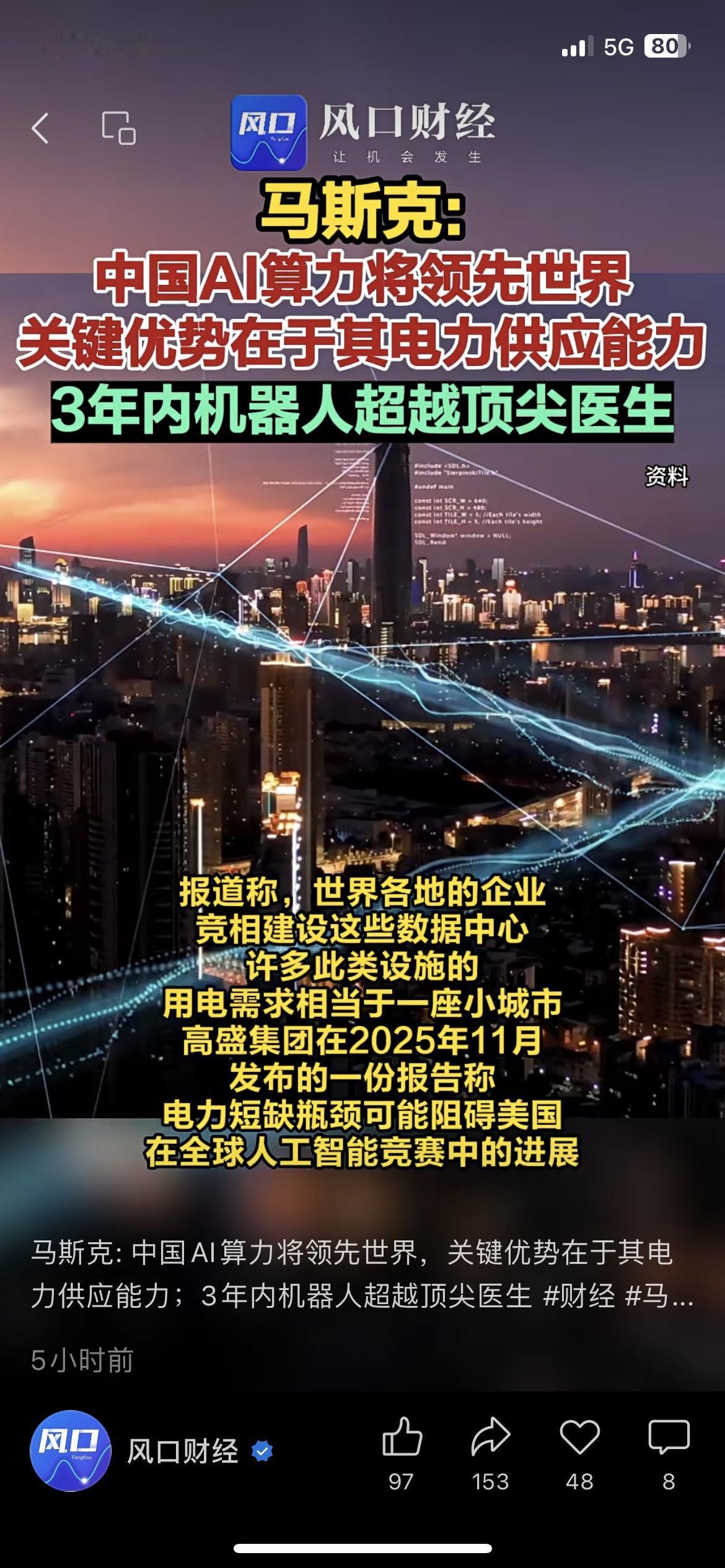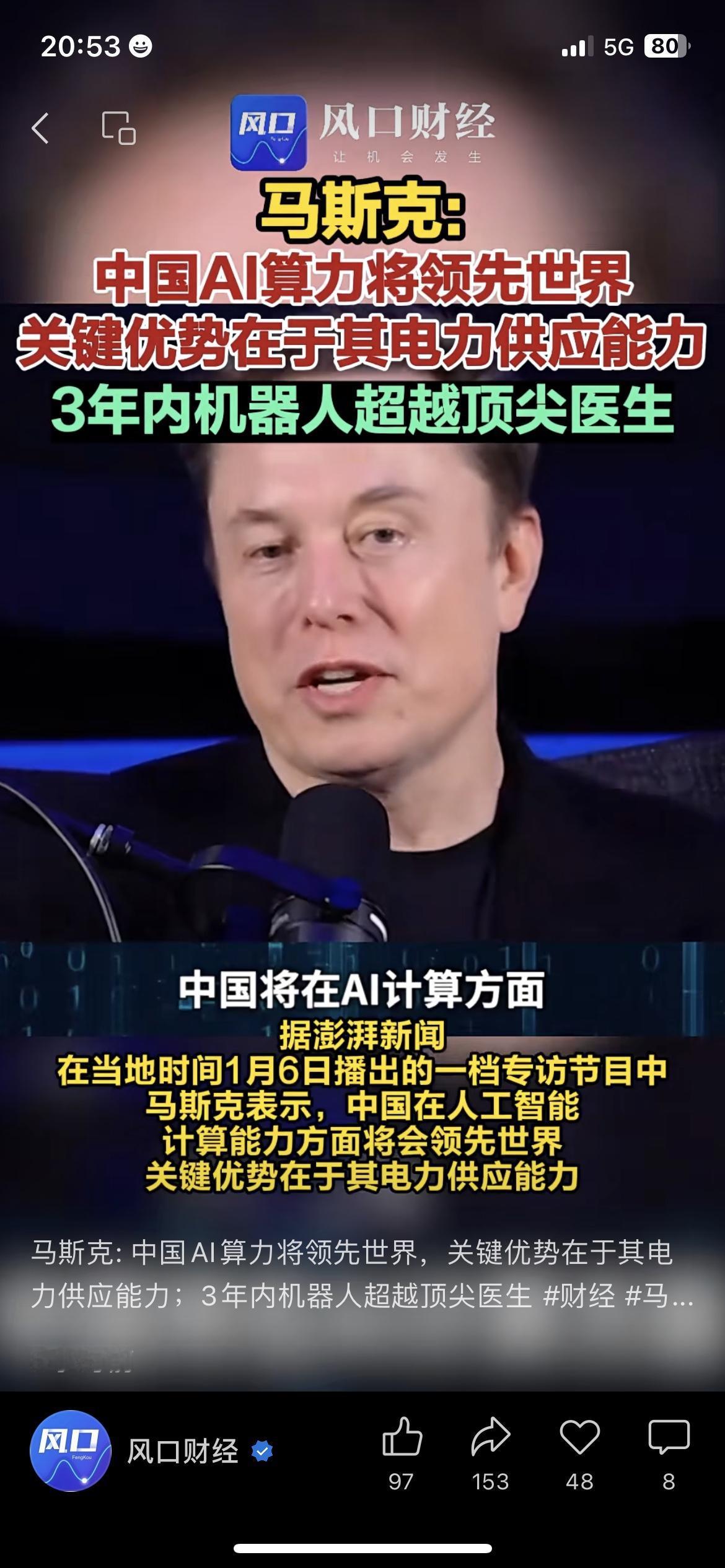 马斯克:中国AI算力将世界第一 3年机器人超顶尖医生 科技前沿 马斯克又放重磅观点了!直言中国AI算力会领先世界,关键优势是电力供应能力。 他还预判,3年内机器人外科医生的水平会全面超过人类顶尖医生。 在医院工作的表姐说,现在手术室里已经有AI辅助做手术了,看来以后医疗机器人会更普及。 马斯克还夸了中国的太阳能发展,说这为AI算力提供了充足的能源支撑。 你相信3年后机器人能比顶尖医生还厉害吗?你愿意让医疗机器人给你做手术吗?ai发展新趋势