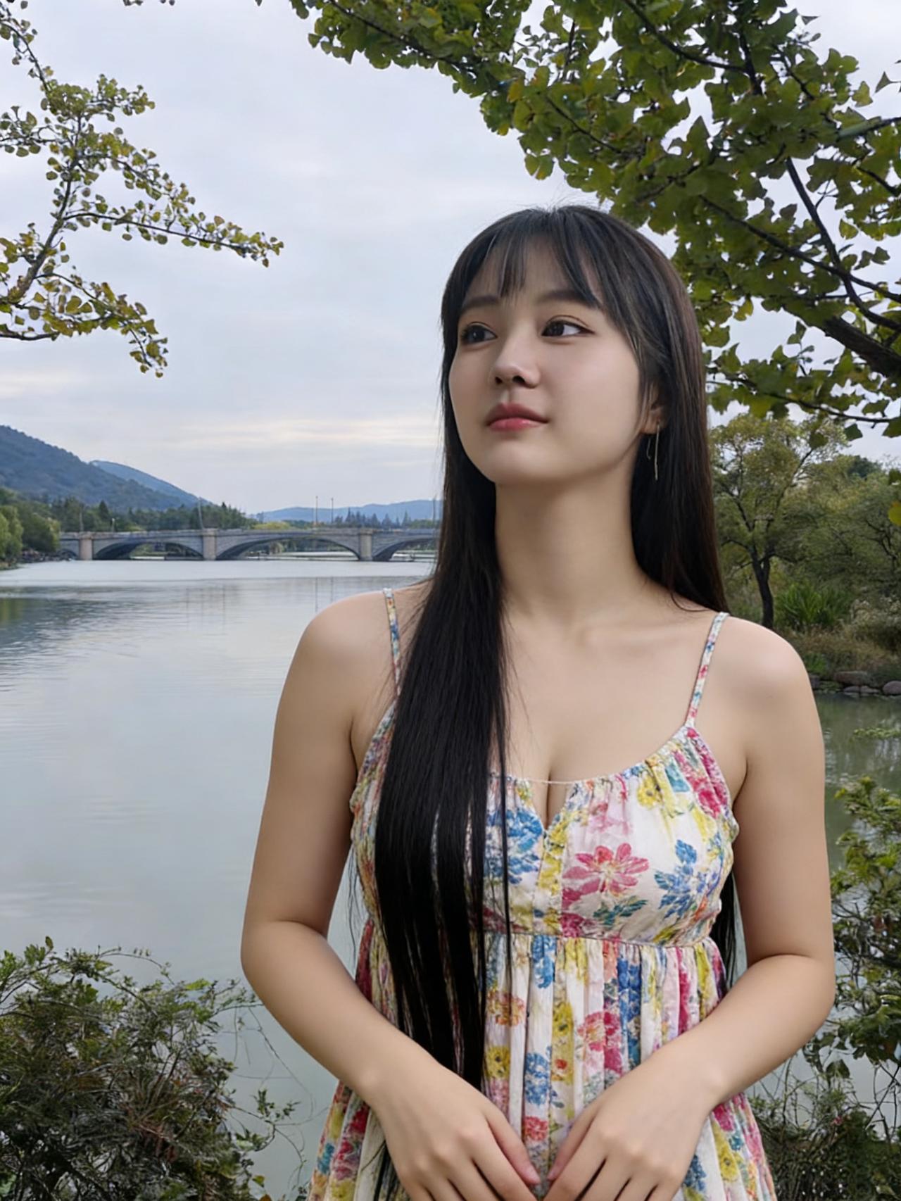 晓岸风柔拂柳丝,佳人凝立水湄时。 碎花裙曳春光色,黑发文垂玉露姿。 云影徘徊浮碧浪,莺声宛转绕芳枝。 无端心事随波远,目断遥天寄所思。