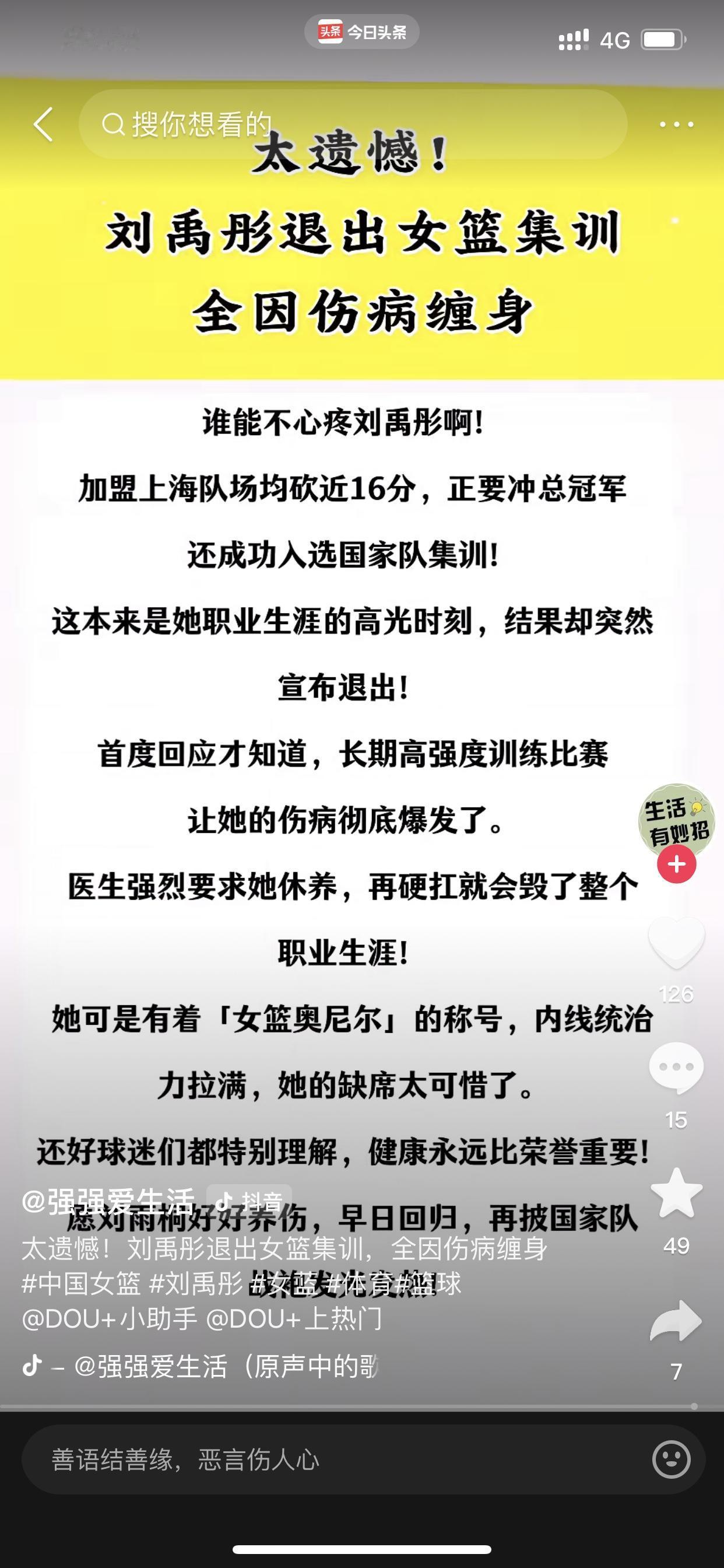 女篮刘禹彤没有退出中国女篮集训队! 是被人在网上造谣了!(请看图二) 网上有人发布假消息,说刘禹彤因为伤病而退出了中国女篮正在进行的集训队伍 我刷到这个消息时,我就敢断定是假的 如果是真的,就不是这个什么名不见经传的人发布此则消息 而是会有官方发布 从我刷到这个消息,我为了最终求证这个消息真伪,我特意从昨天等到现在,然已经过去快一天时间了,我都没有看到中国女篮国家队官方账号发布 所以可以百分之百确定是假的!