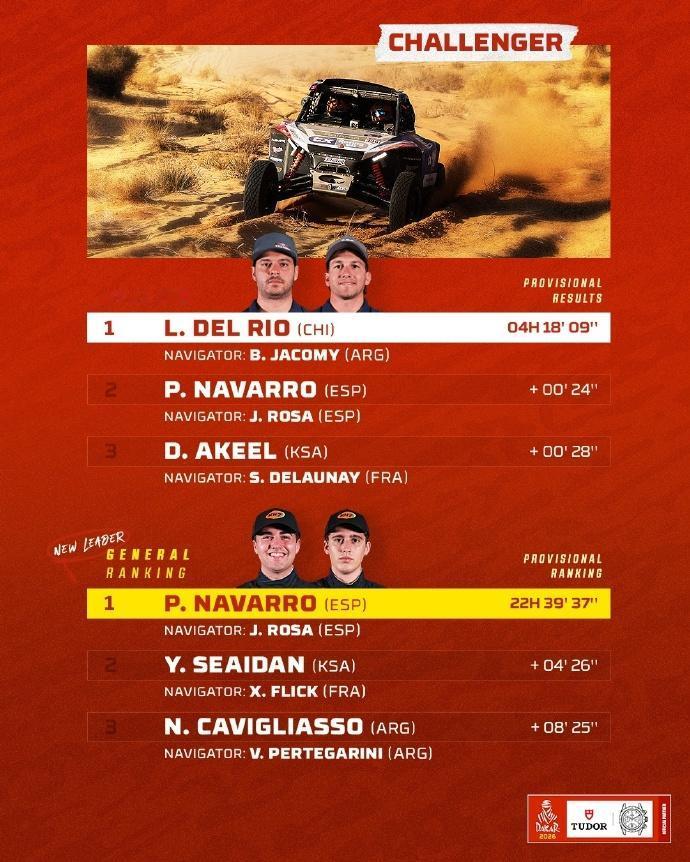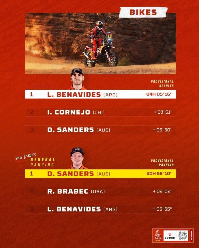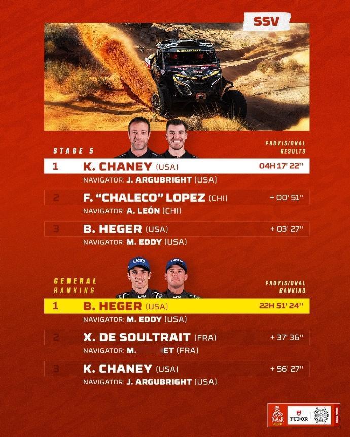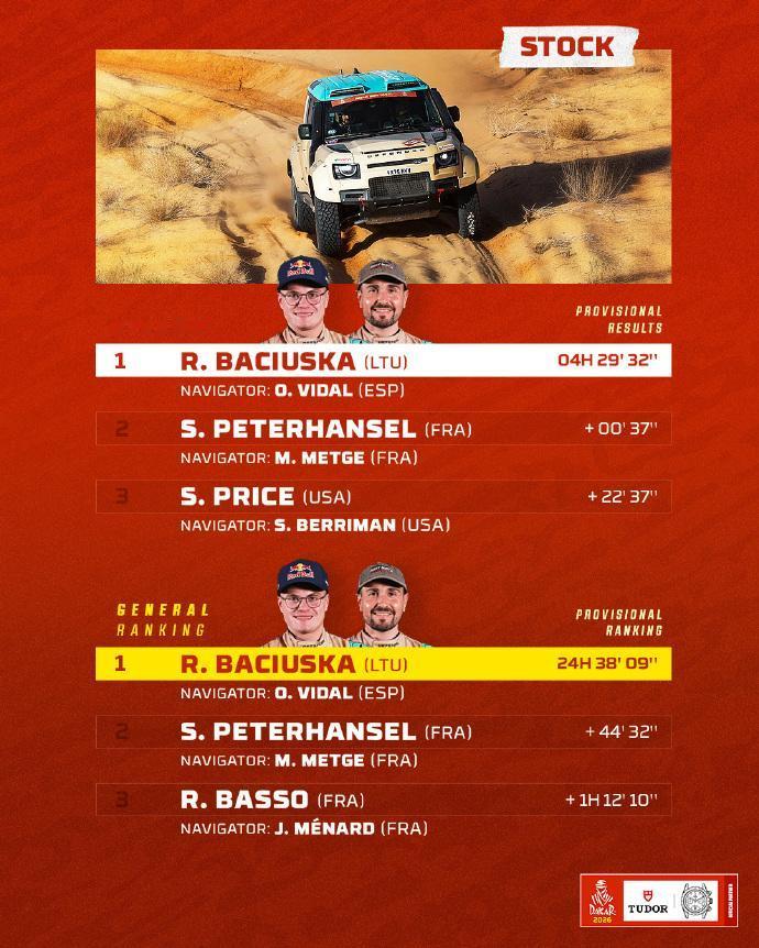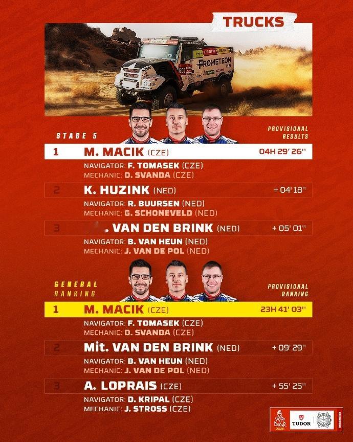 赛车:2026达喀尔拉力赛第5赛段战报 第五赛段介绍 营地 ➡️ 哈伊勒 🏍️ 行驶路段:58公里 | 特殊赛段:356公里 🚗 行驶路段:56公里 | 特殊赛段:371公里 🕒 发车时间(GMT+3) 🏍️ 07:30 🚗 08:00 北京时间1月8日,2026达喀尔拉力赛结束第5赛段的争夺,各位车手今天经过了马拉松赛段的争夺。 汽车组方面,德梅乌斯遭遇机械故障损失近3个小时,格思里取得今天的赛段冠军,而拉特甘继续保持在总成绩榜榜首,领先阿尔阿提亚3分17秒,埃克斯特罗姆暂列第三。 摩托车组方面,多位车手遭遇爆胎问题退赛,卡奈特也遭遇爆胎导致总成绩损失超过4个小时。桑德斯依然领跑总成绩榜,但积分榜前三位只相差6分钟。 6个组别成绩单(TOP3)↓ 🚗 T1+组:福特车手车米奇·格思里夺得赛段冠军,拉特甘领跑总成绩; 🚘量产T2组:路虎车手诺卡斯夺得赛段最快 ,总成绩领先接近1小时; 🏍️摩托车组:卢西亚诺·贝纳维德斯赛段冠军,沙丹尼尔·桑德斯领跑总成绩。 中国军团: 220号中国名将韩魏,在马拉松赛段的第二部分(第五赛段)遭遇迷路,损失了大量时间,最终以4小时32分51秒的成绩完赛。不过即便如此,他依旧在总成绩上排名第25位,领跑中国军团汽车组; 凯越厂队车手尼尔斯·泰里克(NEELS THERIC),继在昨天的比赛中,帮助凯越车队赢得参加达喀尔以来的首个赛段冠军后(R2组),今天再次登顶,赢得两连胜。