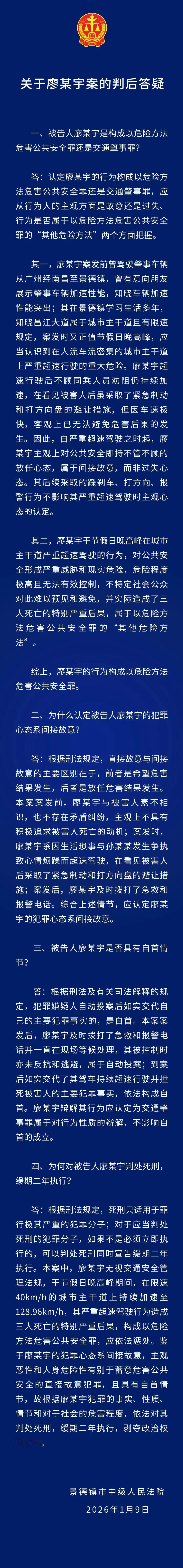 没判死刑,我们不服。 跟女朋友吵架心情差,油门踩到底把一家三口撞死,11个月大的婴儿身首分离,身子卡在车里、头滚落车下,婴儿的爸爸到死眼睛都没闭上,妈妈的爷爷得知孙女被撞死,经受不住第二天也死了。惨剧发生后,肇事司机被拍到站在路边淡定抽烟,司机的父亲说他儿子又不是故意的,受害者家属逼人太甚,还称儿子一旦被判死,“自己的命也不要了”。 这就是发生在2024年10月2日18时30分的江西景德镇一家三口被撞身亡案,今天(1月9日)这起全国网友都在关注的案件判了,被告人廖某宇犯以危险方法危害公共安全罪判处死刑,缓期二年执行。法院自己也认为廖某宇犯罪情节恶劣,后果特别严重,既然是这样为啥没判死刑呢?原因是廖某宇紧急踩了刹车、打了方向盘避让,犯罪心态系间接故意,且具有自首情节。