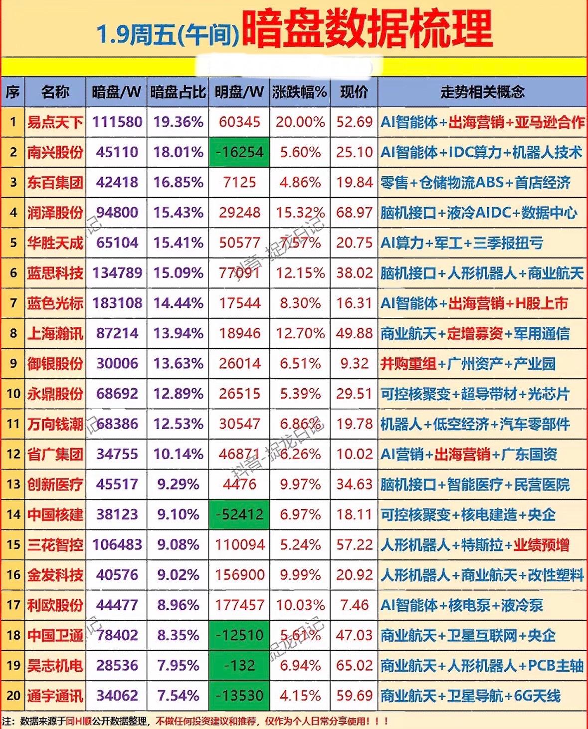 今日周五1月9日暗盘主力资金操作AI概念股活跃,智能体、脑机接口、商业航天领涨,多股暗盘表现强劲,涉及机器人、算力等热门赛道。