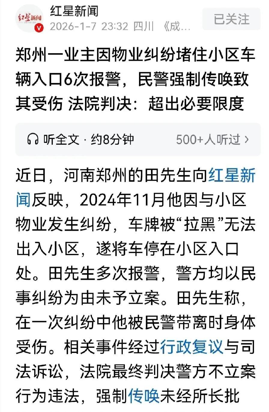 郑州男子维权反被断3根肋骨!6次报警无人管,法院判决大反转太解气 郑州这起业主维权案,看得人血压飙升! 田先生十年前响应黄标车淘汰政策,把车交给社区,拿了500元补贴。社区口头承诺,剩下的补偿用终身免物业费来抵。可新物业入驻后不认账,直接拉黑田先生车牌,多年不让他开车进小区。 2024年11月24日,田先生装修房子要搬东西,再次被保安拦在门外。他气不过,把车往小区唯一进出口一横:你不让我回家,谁也别想进出! 这下彻底捅了马蜂窝,大批业主被堵在门外,现场乱成一锅粥。 田先生一天之内6次报警求助,想让警方解决物业不让进家的纠纷,可每次都被以“民事纠纷”为由拒绝立案。 直到物业报警,民警才火速赶到。 面对堵门的田先生,民警两次口头警告让他挪车,他犟脾气上来拒不配合。民警直接用辣椒喷雾喷他,还强制将他带离。 第二天田先生从派出所出来,去医院一查,右侧3根肋骨骨折,全身多处擦伤! 更让他憋屈的是,此前物业报警说他堵门,警方立马以“扰乱公共场所秩序”立案调查;而他6次报警维权,却连个立案回执都没拿到。 田先生不服,申请行政复议,结果两次被驳回,理由是“警方处置合规”。 走投无路的他只能告到法院,没想到,反转来了! 法院审理后明确判决:田先生与物业的纠纷属于派出所管辖范围,警方未对拦截田先生进小区的物业人员作出处理,且对田先生多次报警置之不理,该行政行为违法! 一场业主维权,愣是被折腾到骨折,6次报警无人管,物业一报警就火速出警。 说到底,警方的职责是维护公平正义,不能只听一方诉求,更不能无视普通百姓的合理求助! 你觉得物业当初的做法合理吗?欢迎在评论区聊聊!