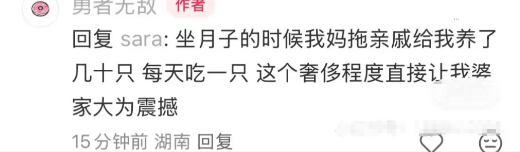 坐月子的时候我,妈拖亲戚给我养了几十只,每天吃一只,这个奢侈程度直接让我婆家大为震撼