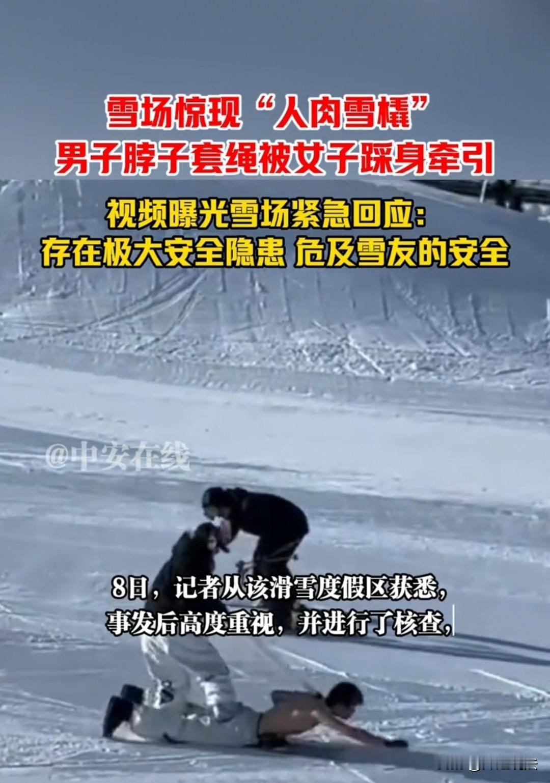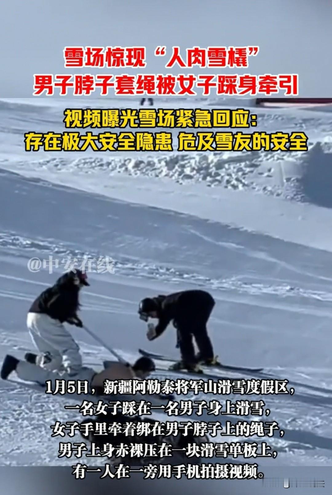 新疆,一名女子竟踩在上身赤膊的男子身上,手中还牵着绑在男子颈部的绳子,两人竟打算从雪道上滑下。旁边还有人举着相机拍摄记录,这一幕令人咋舌。如此出格的玩法,不仅存在极大安全隐患,既可能伤害自身,也会危及他人,更与公序良俗相悖,实在让人难以理解其背后的意图。 在新疆的一处滑雪度假村中,滑雪爱好者们正在尽情地与雪来一场近距离接触。 这时有人发现,一名男子为了与雪更“亲 密”接触,居然把上身的衣服全脱了。 大家纷纷议论:这难道不冷吗?爱雪也不能这样极端,还是应该以身体为重啊。 可接下来的一幕,更让众人瞠目结舌,实在猜不透这几个人到底要玩出什么花样。 只见一名女子走了过来,手里拿着一根长长的绳子,把绳子前端绑在了男子的颈部,随后又指了指雪地上的单板,似乎是让男子趴在上面。 众人都觉得十分好奇,纷纷驻足观看,想看看他们两人到底要怎么滑。 正当赤裸上身的男子趴在单板上时,那名拿着绳子的女子,居然直接踩在了男子的身上——这可太危险了! 男子光着身子趴在雪板上,女子的重量踩上去,万一把他的身体踩伤了怎么办? 关键是女子手里还牵着绑在男子颈部的绳子,一旦发生侧翻,女子若把控不好绳子,万一扯到男子的脖子,造成扭伤甚至更严重的后果怎么办? 本来天气条件就比较恶劣,这些意外一旦叠加,很可能会出人命。 到时候玩没玩好,受伤的受伤、被拘留的拘留,实在是得不偿失。 就在这时,旁边还有一名滑雪者拿着手机,摆出要给他们拍“绝美大片”的造型。 这让其他滑雪者都频频摇头:这里可是度假村啊!大家来这儿是为了玩得高兴,他们这样的玩法,实在让人不寒而栗。 随后,赤裸上身的男子做出了向前冲的姿势,左手握着拳头、伸直向前,右手向后保持平衡。女子踩在他的身上,拉紧绳子,两人顺势从雪道滑下。 这一幕,倒像是女子踩着马背的感觉,也像是女子需要踩着男子、拉着绳子才能保持平衡。 反正不管怎么猜测表述,这样的行为就是充满危险。 旁边负责拍摄的人不但不加以阻拦,还任由他们胡闹,甚至特意为他们拍大片、留影,实在是奇葩。 网友们很快将拍到的视频发布到网上,纷纷感叹:现在有些年轻人真是在玩火自焚!不出事则罢,一旦出事,不仅会殃及他人,更会毁了自己。 度假村的工作人员接到举报后也惊魂未定:这件事一旦出了意外,他们绝对逃脱不了干系。 工作人员赶紧承诺,会马上展开核查。如果几人的情节属实且恶劣,将直接把这三个人拉黑,永远禁止他们进入度假村。 因为度假村不仅是供人游玩的地方,更要保障所有人的安全,“安全而来,安全而归”才是他们的服务宗旨。 工作人员还强调,这样的玩法很可能会殃及其他滑雪爱好者,一旦发生碰撞,很可能会造成致命伤害。 而对于当事人自身来说,不管是冻伤、踩伤,还是侧翻时扭到脖子,都会造成严重伤害。 总而言之,这种行为对所有人都没有好处。因此,度假村今后将会加大巡查力度,杜绝此类事件再次发生,还度假村一个纯粹、安全的游玩环境,也让其他游客能够安心滑雪。 不过,网友们依旧十分不解:这种低俗又不雅的滑雪方式,真的有必要去尝试和拍摄吗?他们到底想传递什么样的价值观? 一、这种滑雪方式实在让人不解,还藏着很大的安全隐患,大家千万别学,一定要引以为戒,别给自己找受伤的麻烦,也别影响别人的身心健康。 《治安管理处罚法》:扰乱公共场所秩序、妨害公共安全的,可处警告、罚款或行政拘留。 《刑法》:以危险方法危害公共安全,尚未造成严重后果的,处三年以上十年以下有期徒刑。 涉事男女的行为涉嫌妨害公共安全,或受治安处罚,情节严重的可能触犯刑法需担责。 二、度假村真该加大巡查力度,不管这事有没有人受伤,都能看出监督工作有漏洞,希望以后再也别发生类似的事。 《民法典》:公共场所经营者未尽到安全保障义务,造成他人损害的,应当承担侵权责任。 涉事度假村需履行安全保障义务,未及时制止危险行为,需承担相应补充侵权责任。 对于此事,大家如何看? 素材来源于中安在线2026.1.9