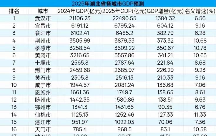 湖北各市2025年GDP预测出炉:宜昌咸阳差距扩大、荆州领先孝感、潜江破千亿 湖