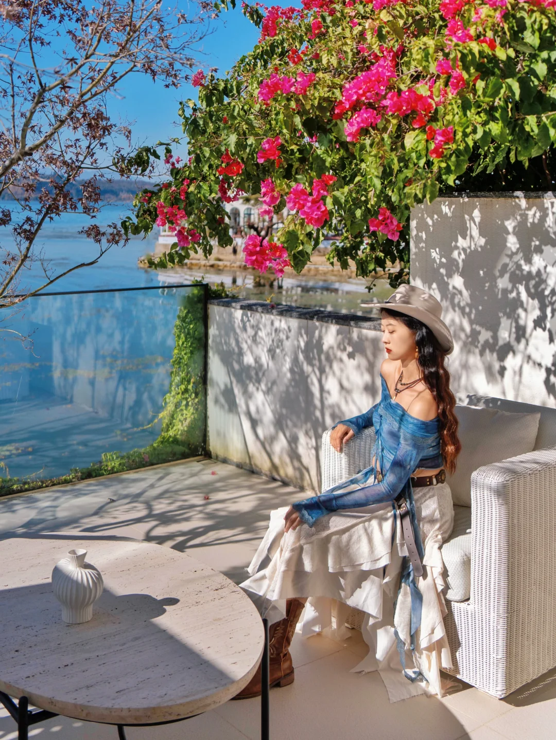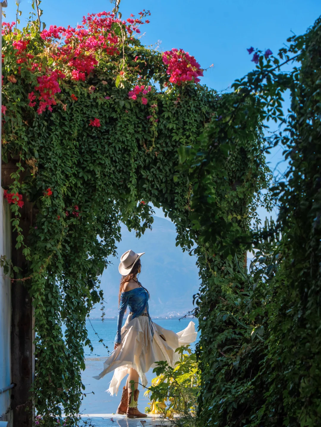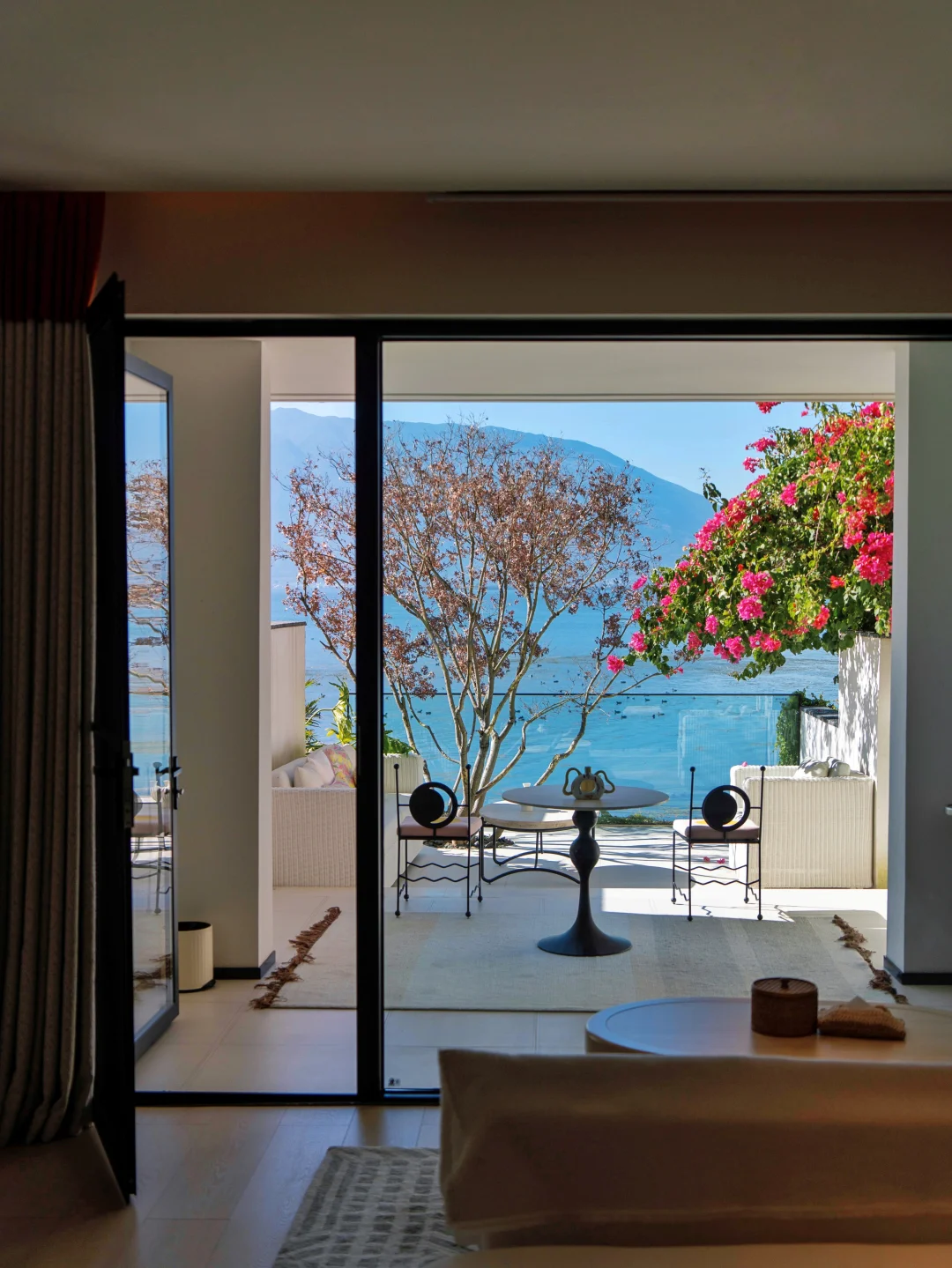 2️⃣大理住宿可以住古城附近也可以住双廊附近,我是住在了双廊的安止风随花开,酒店边上通往洱海的小路上开满了三角梅,坐在大厅里紧邻洱海,来一份下午茶好惬意,清晨拉开窗帘有被哇塞到,房间也是直面洱海,有一个大大的露台,上面也种满了三角梅,早餐的米线好好吃!!