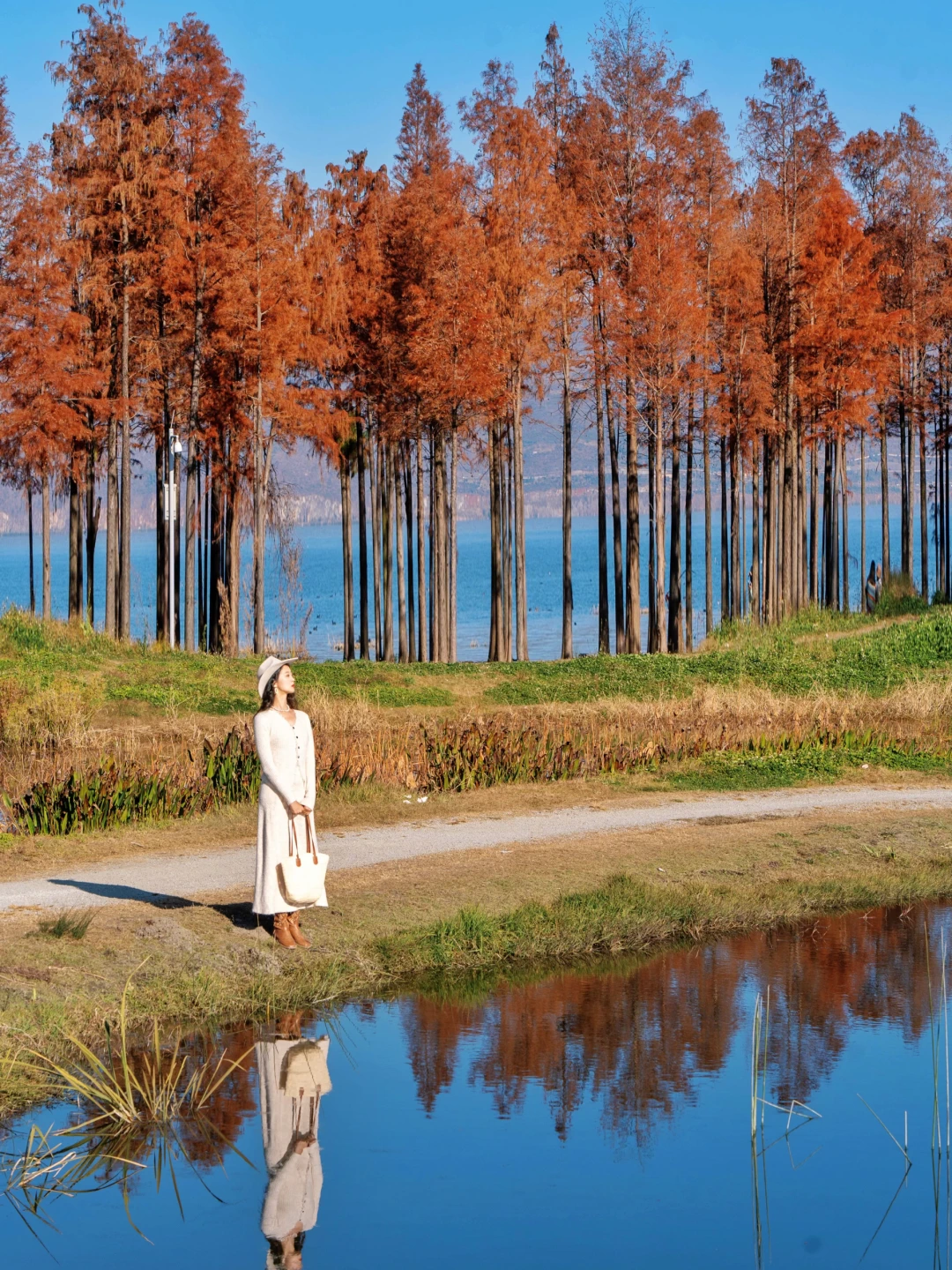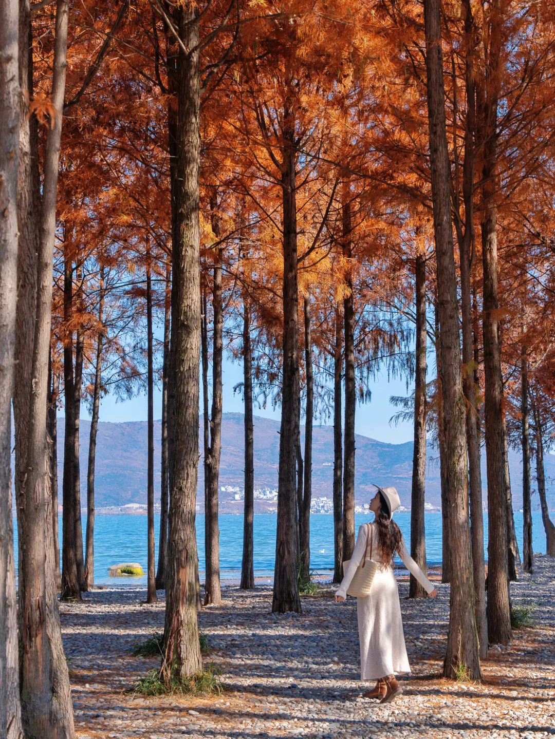 以洱海边一长条的红杉林为背景,站在中间的小路上拍