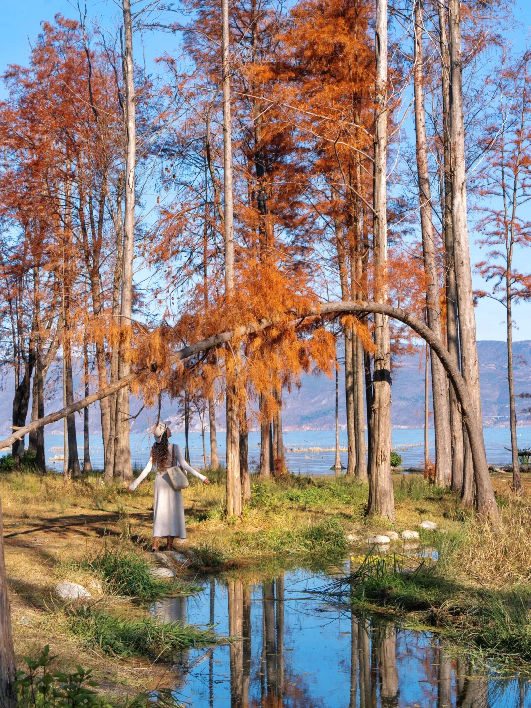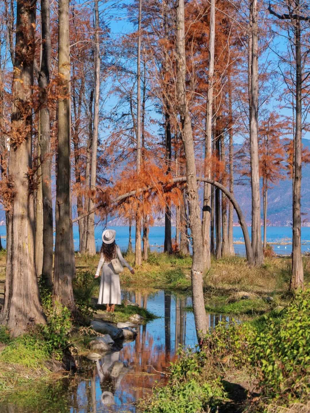 站在溪流前拍,能拍到两块蓝色的水面,还有背后的水杉林
