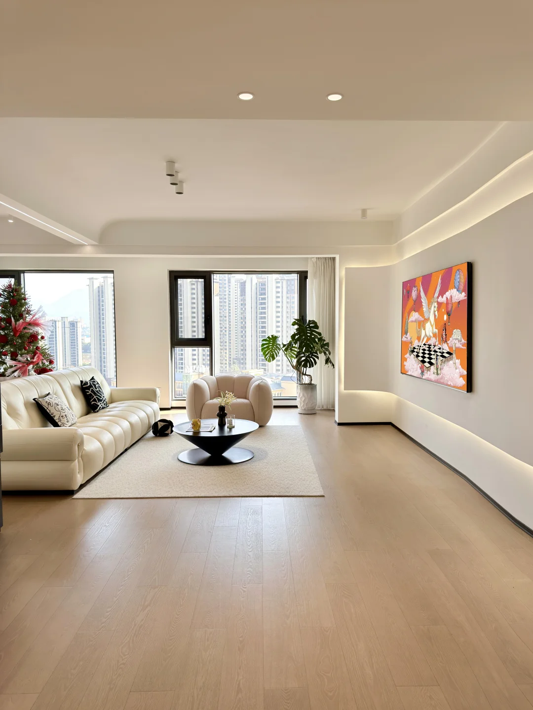 我家🏠建筑面积140平,套内118平,四房改三房 装修预算有限,自己设计自己找工人 硬装做减法,不过度装修 全屋通刷乳胶漆、地面通铺木地板 没吊大平顶,简单的单眼皮边吊+明装无主灯 软装上少而精,添置一些简单高级的家具家电 最后硬装15w,软装10w装出了我想要的极简风~🍃 . 我家客厅装修最得意之作就是电视背景墙 弧形悬浮款式 简约又有设计感 入住三年了 依然觉得很耐看很喜欢[萌萌哒R] 关键当初只花一千出头做的 省下来的钱入手了一台无缝贴墙的壁纸电视 颜值高、显高级而且巨实用✨ . 满足了我对电视既要超薄又要好看还好画质的高要求 不愧是的26年必买的电视 我家的这款是创维壁纸电视A7HPro 超薄无缝贴墙配合90度直角画框设计 正看侧看和挂在墙上的画没有任何区别 挂上墙简直就是一件精致的艺术装置 家里的格调瞬间提升好几个level~ . 像我家客厅,两面大落地窗采光非常好 画境屏技术,不论哪个角度看,都不反光,画面清晰到细节都能看清~ 升级的超微距Mini LED追剧、看电影色彩还原度直接拉满,细腻又真实,人物的毛孔发丝这些细节都能看清 还有它的音响效果直接把我惊艳到了[赞R] . 哈曼全景声双回音壁 在家看电影听音乐的时候 声音从四面八方传来,身临其境,沉浸感十足 有种把电影院搬回家的感觉 . 不得不说这台壁纸电视 真的大大提升了我的居家幸福感 劳累了一天回到家,打开像艺术品的电视机 追追剧,陪娃看看动画片 真的太治愈了~[派对R]