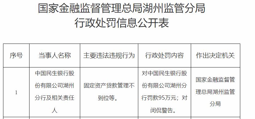 【固定资产贷款管理失察,民生银行湖州分行被罚95万,责任人遭警告】 中国民生银行股份有限公司湖州分行及其相关责任人在固定资产贷款管理方面存在履职不到位等问题。 基于此,国家金融监督管理总局湖州监管分局作出如下处罚决定:对中国民生银行股份有限公司湖州分行处以95万元罚款; 对闵 侃予以警告。