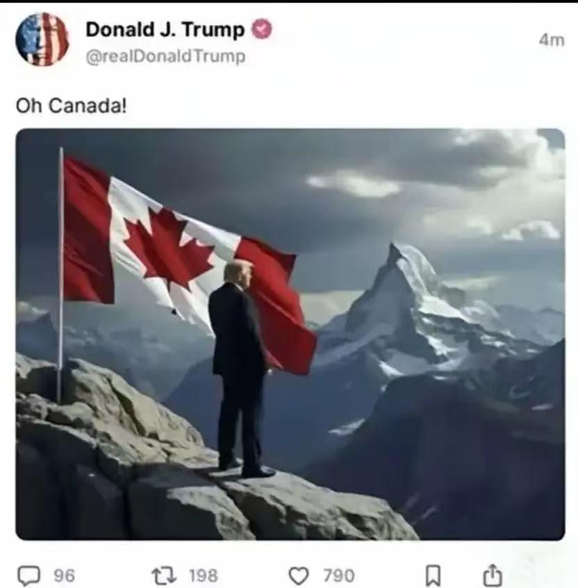 特朗普,这老小子又发图文了。 意味深长。 他站在高山之巅,左手边是枫叶旗,配了一行字,"Oh Canada!" 我的个乖乖哟,莫非盯上了加拿大? 这可不是随口说说的调侃,这张疑似AI合成的图文背后,藏着特朗普一贯的霸权逻辑。早在2025年初,他就公开“建议”特鲁多当美国“第51个州州长”,如今再晒枫叶旗,野心昭然若揭。 美加贸易战早就打得火热,2025年2月特朗普率先对加拿大商品加征25%关税,后续更是一路飙升至35%,钢铝产品税率直接翻倍。这波操作让加拿大4月贸易逆差飙至71亿加元,创下历史最高纪录。 加拿大对美出口占总出口的68%,经济产出的五分之一依赖对美贸易,特朗普掐住了人家的经济命脉。可他不管这些,为了“美国优先”,连盟友的利益都能随意牺牲,所谓的盟友情谊在关税面前不堪一击。