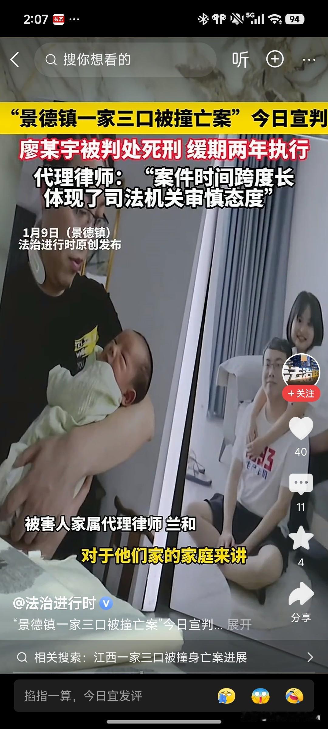 景德镇一家三口灭门断子绝孙惨案凶手竟然只是判死缓。难怪到今天凶手和他家属依然态度嚣张、毫无愧疚、更无悔过之意。 凶手主观故意并且放任结果发生。事实结果导致两大一小三人死亡。这家是两代单传这一撞他家从此绝后。 最荒唐是法院判决缓刑的依据。竟然是撞击之前凶手廖某踩一下刹车和打一下方向盘就成他保命符。但凡会开车老司机都知道高速行驶如果要避免事故发生,速度距离很关键。一百多速度在城市道路限速四十最后几十米距离轻打一下方向和踩一下刹车对恶性结果发生毫无作用。 前面说了刹车和打方向和结果关联性。现在聊一下凶手廖某是要避免事故发生降低危害性,还是撞击之前廖某担心自己小命本能的应激反应呢?我觉得大概率是人本能避险反应。 你们觉得一个能杀了一家三口凶手,仅仅判死缓合适吗?可能凶手廖某只要二十年就能出狱。如此丧心病狂会不会从此仇恨社会报复社会呢?