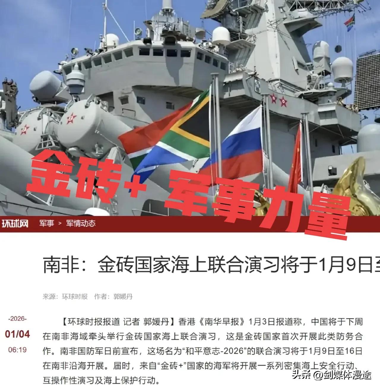 中国牵头的“金砖国家军演”让世界看到了“被美国搞得乌瘴气之世界" 的希望曙光! 1月9日到16日,在南非海域搞“和平意志-2026”军事演习,中国牵头,俄罗斯、伊朗确认参加,印尼和埃塞俄比亚可能也参加。 如今金砖国家意识到了除了经贸上的合作之外,金砖国家的安全极为重要,特别是以美国为首的 G7 国家视金砖国家为眼中钉,而特朗普多次表达到对金砖国家进行额外关税制裁。为此作为一个强大的经济组织也必须有一个强大的军事力量作为保护。 随着金砖国家加入国越来越多,越来越成为许多国家向往的组织,为此金砖国家的安全就显得格外重要了。金砖国家始于 2009年,如今从巴西、俄罗斯、印度、中国、南非五个新兴国家到 2010年南非加入,2023年扩员加了埃及、埃塞俄比亚、伊朗、阿联酋、沙特阿拉伯,到2024年印尼也正式入伙,现在一共11个成员。其中金砖家家的 GDP 占世界的 30% 以上,贸易额达全球 25% 之多,这完全就是可以与美国为首的 G7 相比抗衡的经济力量了。 所以加强金砖国家的安全就提上的日程,南非国防部在1月3日声明,这次演习代号“和平意志-2026”,持续8天,从海上防卫到联合安全行动,再到互通性演练,重点练协同作战和护航道安全。中国派052DL型驱逐舰唐山舰和补给舰太湖号参演,俄罗斯和伊朗也派舰艇,规模不算大,但在金砖国家当中 ,中国与俄罗斯的军事力量是世界排行第二 第三的位置 ,其军事力量的合国是超过美国的。 所以就在美国抓捕马杜罗之后 美国政府越发膨胀之时,美国军事力量就成为特朗普想干什么就干什么的强有力工具,美国特朗普更加将美国军费提升到 1.5 万亿美元以壮大美军的力量,为美国将来为所欲为提供强有力的支撑。 所以此时的世界更需要如中国 俄罗斯等正义的力量,以应对“非正义”的美国霸权,让世界的秩序才趋于稳定,世界才会得到良情发展,让美国的丛林法则破产去吧!