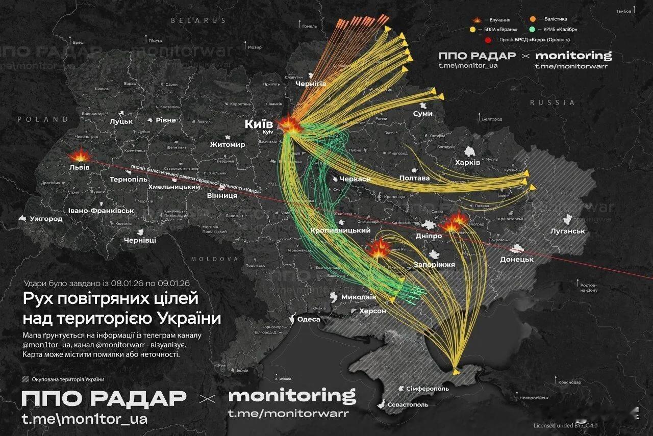 【俄军夜间空袭打击范围示意图】基辅为首要目标,乌克兰首都已确认遭到多轮组合式打击,能源基础设施损毁严重,平民出现伤亡情况。