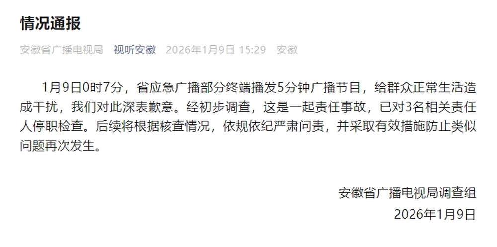 1月9日0时7分,省应急广播部分终端播发5分钟广播节目,给群众正常生活造成干扰,我们对此深表歉意。经初步调查,这是一起责任事故,已对3名相关责任人停职检查。后续将根据核查情况,依规依纪严肃问责,并采取有效措施防止类似问题再次发生。