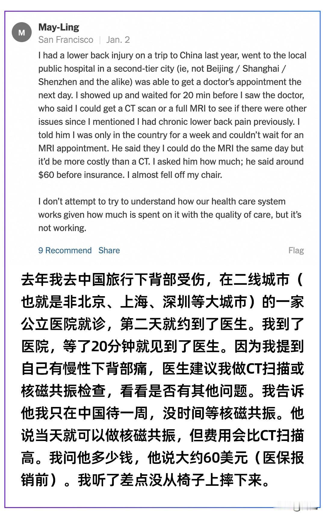 老美网友开年集体破防,谁能想到,中国看病居然如此亲民!还有人打“飞的”来中国挂号买药! 最近海外社交平台上,一股“中国看病热”正在悄然兴起,许多老外发视频感叹:太便宜、太高效、太不可思议了。有人晒出自己在中国挂号当天就能拍核磁全套检查,还不到100美元;有人看病买药30分钟顺滑结束,花费才几十美元。 更离谱的是,还有美国网友发现,在中国接受一次AI癌症筛查,居然只要25美元。这才让习惯动辄几百上千美金看病的美国网友集体情绪失控。而这项AI癌症筛查技术,还登上了《纽约时报》2026年开年的整版头条。 这项AI技术,来自阿里达摩院,名叫PANDA。根据《纽约时报》的报道,它能在一张普通的非增强CT中,精准识别胰腺癌早期病变,准确率高达93%。而这套AI模型,在宁波的一家医院已累计分析18万张CT图像,成功发现20多例胰腺癌病例,其中一半以上为早期。 于是这条新闻的评论区炸了。有网友表示“在中国,非增强CT只要25美元,还是医保报销前的价格,甚至被纳入年度体检;但在美国,同样的检查没有保险就可能要几百到上千美元”。还有人表示“20美元在他们的医院,连停车费都不够。” 评论区里还出现了一串“赛博许愿”:希望媒体多报道别国医疗与AI进展,让美国人看清自己到底错过了什么;希望这种AI早点进入美国;希望更多中国的专用AI继续做下去,因为这才是新技术的正确用法。 其实,这已不是PANDA第一次被国际关注。早在去年,它就获得了美国FDA“突破性医疗器械”认定,在国际顶会上也多次发表成果。 可以说,从这次外媒和外国网友的态度中能看到,阿里医疗AI正在为国争光,中国AI不仅强大还让普通人都用得起,这才是AI应该发挥的价值。