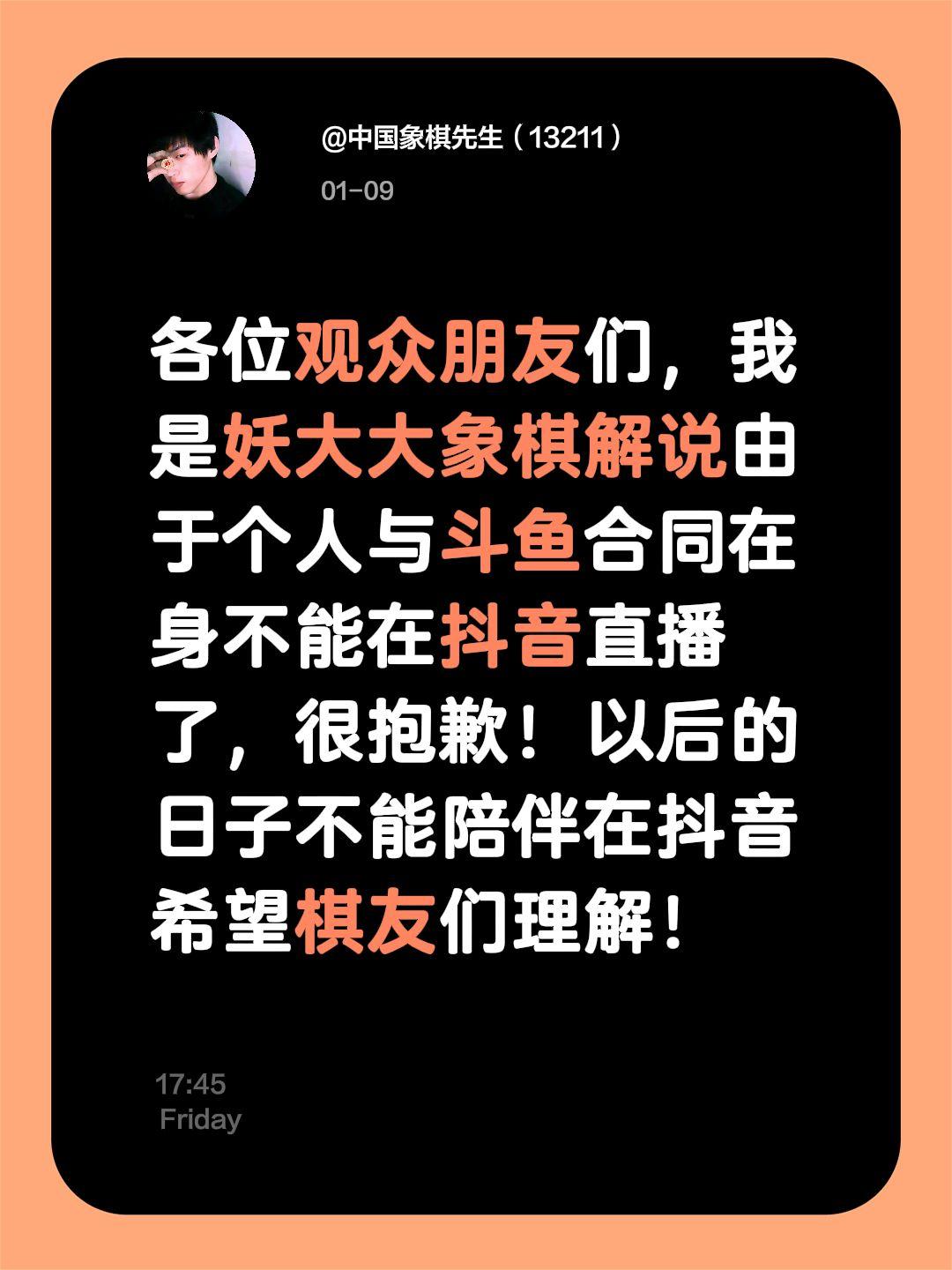 各位观众朋友们,我是妖大大象棋解说由于个人与斗鱼合同在身不能在抖音直播了,很抱歉!以后的日子不能陪伴在抖音希望棋友们理解!天天象棋 主播合同 @妖大大象棋讲座
