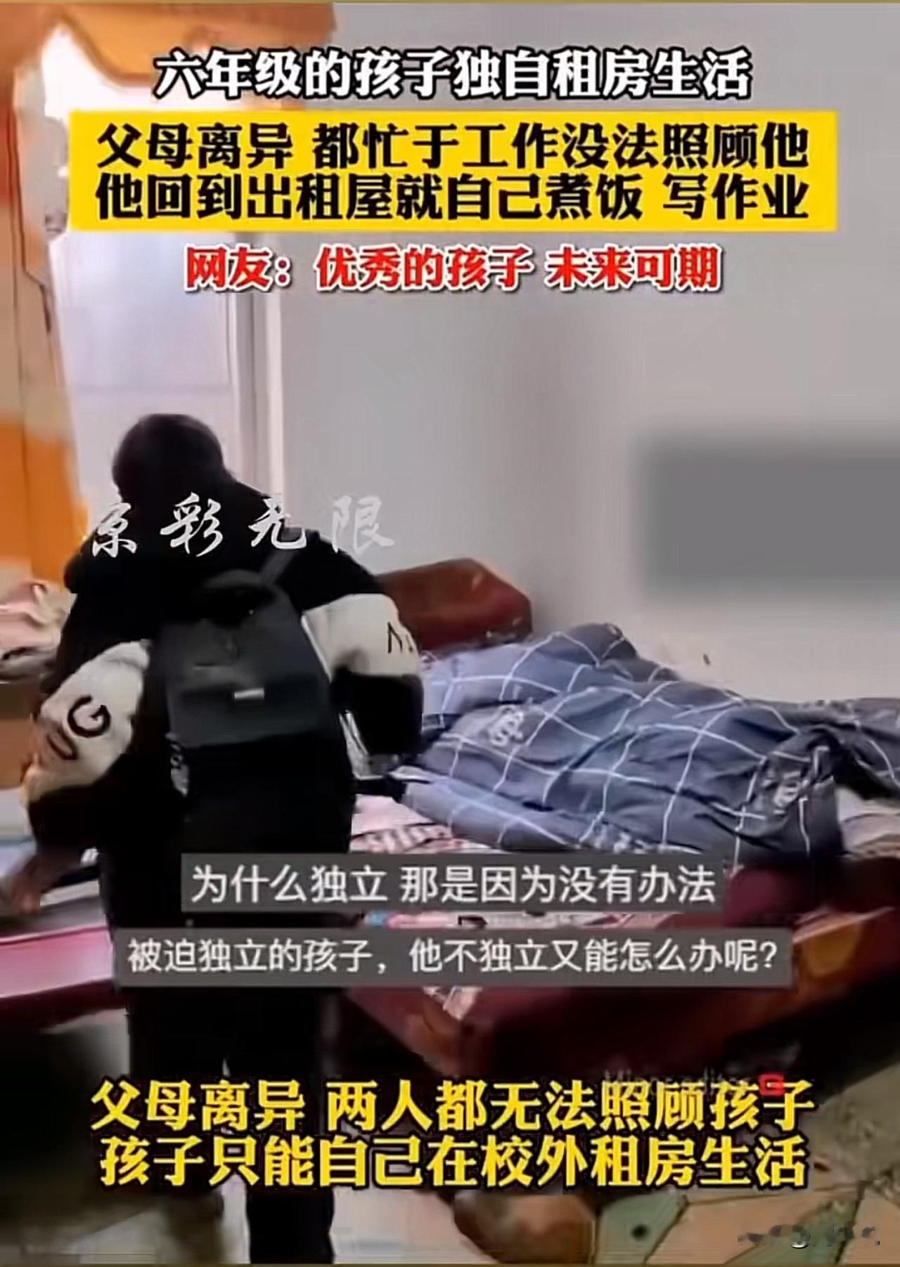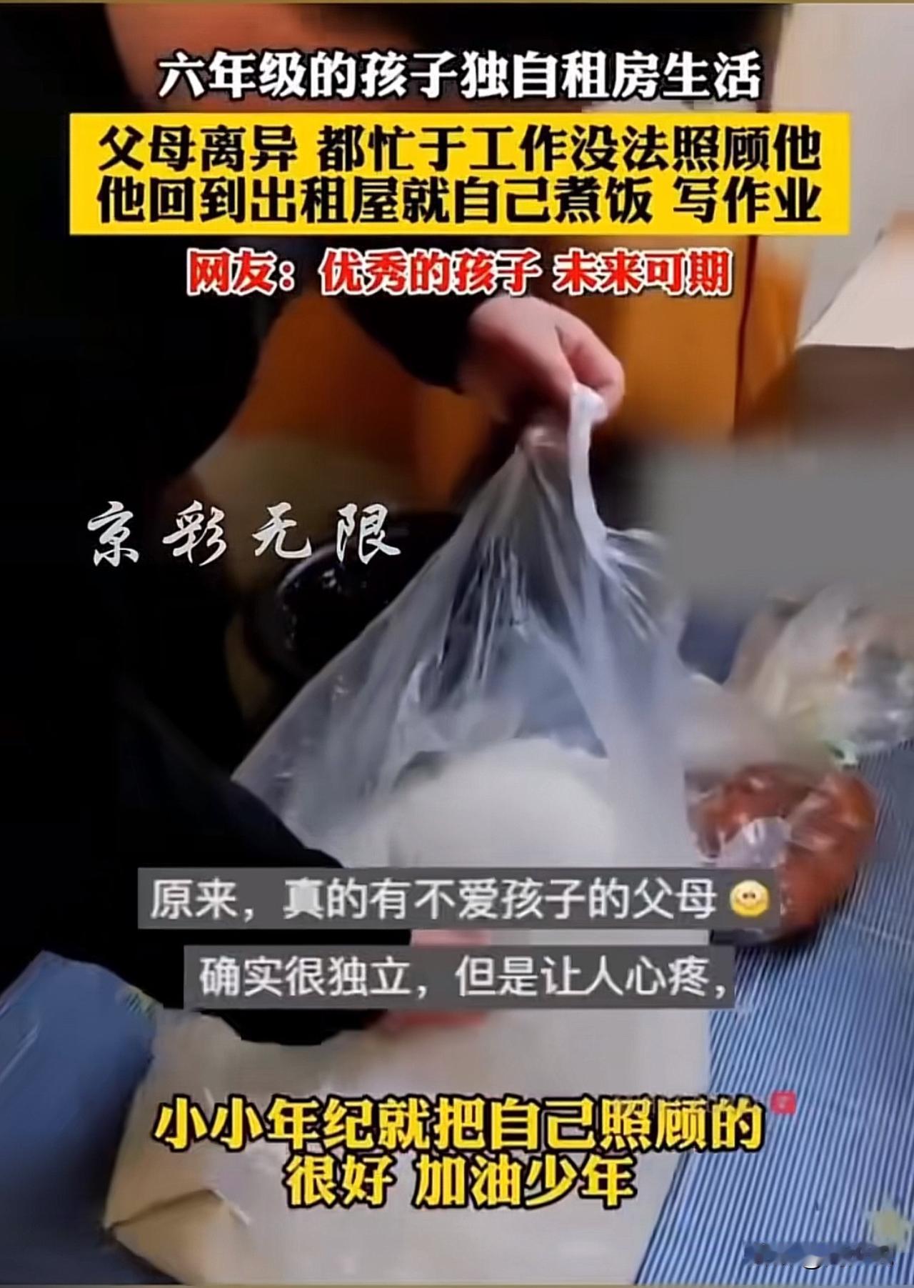 父母离异对孩子的伤害,真的太大了!刷到一条揪心的视频:一名六年级的小男孩,因为父母离异后双方都无暇照顾他,只能独自在校外租房生活。每天放学回家,他要自己煮饭,再默默坐下写作业。那单薄又懂事的身影,看得人心里五味杂陈,满是心疼。 不少网友纷纷留言:“这么小的年纪,本该是被捧在手心的宝贝,却要早早扛起生活的重担!” 都说父母是孩子的避风港,可对这个男孩而言,家却成了遥不可及的奢望。看到这一幕,周少也被惊艳到了,小小年纪就扛起了生活的重担,确实让人心疼。 父母离异本是成人的选择,但孩子不该成为这段关系里的牺牲品。每一个孩子的成长,都离不开父母的陪伴与关爱,这种缺位的亲情,是多少物质弥补都换不回的。 为人父母,既然选择把孩子带到这个世界,就该扛起责任,别让孩子的童年,在孤独与无助中黯然失色。#寻美三湘# #长沙新朋友#