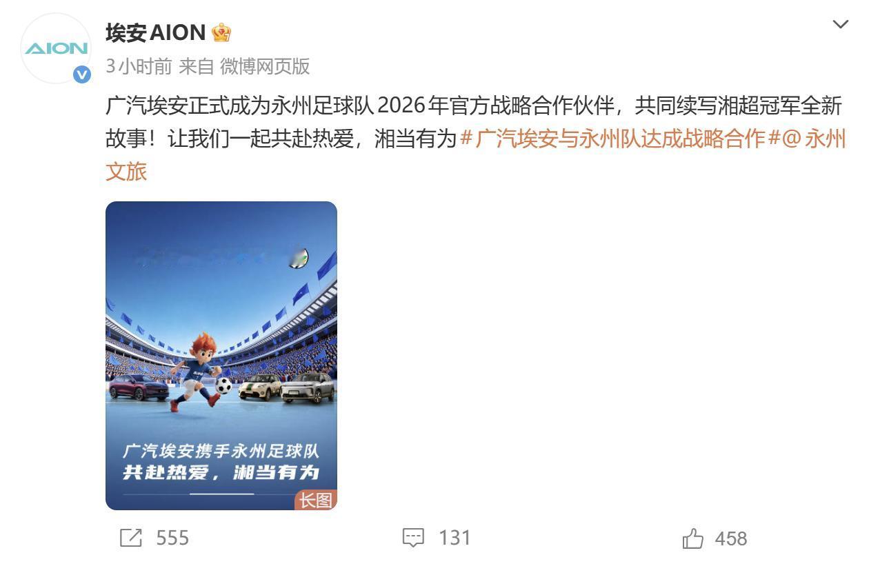作为全球新能源汽车头部品牌,扎根湖南的广汽埃安始终践行社会责任,近日正式官宣赞助湘超冠军永州队,以实打实的支持为国民体育注入强劲动力。此次赞助堪称诚意满满:不仅发起“永州队2025年最佳阵容”全民票选,当选的永州队最佳贡献奖13人将各获一台埃安UT super"永冲锋"冠军版;1月18日至24日CMG群众足球邀请赛期间,全国球迷可通过线上抽奖赢取埃安UT super"永冲锋"冠军版,现场观赛球迷更有机会获得埃安i60增程版使用权1年。2026年湘超联赛中,永州队主场比赛期间还将诞生6位幸运球迷,获赠埃安UT super"永冲锋"冠军版,惊喜贯穿全赛季。 从十三太保广告牌引发全网关注,到广汽埃安的重磅赞助,各界正以多元方式为永州队助威。作为湖南本土有深厚渊源的企业,广汽埃安此前曾为全红婵送车,如今再助力湘超,既以全栈自研技术和灯塔工厂品质为球队保驾护航,更用实际行动推动地方体育发展,彰显了企业支持国民体育、助力全民拼搏的责任担当。 广汽埃安与永州队达成战略合作 永州夺冠
