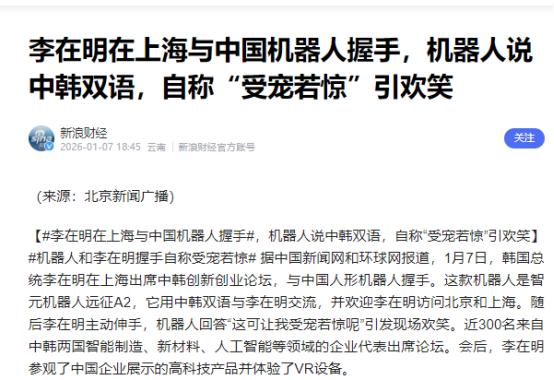 李在明为什么要半路“逃跑”?别信什么行程太忙的鬼话。他是怕面子挂不住。看看咱们上海的机器人,中韩双语无缝切换,连“受宠若惊”这种词都能脱口而出。   当地时间2026年1月7日,韩国总统李在明在上海出席这场论坛期间,被一个人形机器人的回应逗得开怀大笑,这温馨又有趣的互动场面,很快成了全场焦点。   可能有人觉得这就是场普通外交小插曲,没必要过度解读,但结合李在明当天傍晚就急匆匆结束访华、从上海登机回国的举动,事儿就没那么简单了。   官方通报里说他行程紧凑,从1月4日抵京到7日离沪,四天时间跑了北京上海两个城市。可明眼人都能看出来,这所谓的“紧凑”更像是找个台阶下,真正让他坐不住的,恐怕就是论坛上那台来自上海的人形机器人。   当时李在明主动上前和机器人握手,还笑着问了句简单的问候,没成想机器人直接用流利的韩语回应,紧接着又切换成中文补充了一句,连“受宠若惊”这种需要拿捏语气的词都吐得字正腔圆。   李在明脸上的笑看着挺真诚,心里估计早就开始打鼓。他这次带了三星、现代的高管随行,核心目的就是推进中韩在人工智能、智能制造这些领域的合作。结果刚到上海,就被中国机器人上了生动一课,这尴尬程度可想而知。   要知道韩国向来以科技产业为傲,尤其是在机器人领域,早年还总想着在全球市场抢占先机,可现在中国机器人的水平,已经远远超出了他们的预期。   接着发生的一幕,更让这场互动多了层微妙的意味。这台机器人并非只会简单对话,它展示的自主导航、环境识别能力,都是当下商用机器人的核心技术。   现场工作人员介绍,这类机器人已经批量出口韩国,在首尔的不少餐厅、酒店都能看到身影。   李在明身边的三星高管脸色全程不太好看,毕竟他们自家也在做服务机器人研发,可论性价比和技术成熟度,跟中国产品比差了不止一点。   更关键的是这不是个别机器人的优势,而是中国整个机器人产业的集体爆发。有数据显示,现在韩国工业生产线和物流线上负责运输的机器人,六成以上都是中国制造。   就拿最基础的扫地机器人来说,中国品牌在韩国高端市场的占有率已经超过七成,把韩国本土品牌压得喘不过气。李在明作为韩国总统,亲眼看到自家市场被中国机器人占领,现场还亲身体验到中国技术的实力,心里能舒坦才怪。   他这次访华反复强调,希望中韩关系重回正轨,本质上就是想靠合作拉动韩国经济。   韩国的支柱产业,不管是半导体还是汽车,都离不开中国市场和产业链支持。可在机器人这种新兴赛道上,中国已经实现了弯道超车,这让他原本准备好的合作筹码,瞬间变得没那么有分量。   要是再待下去,保不齐还会看到更多让他“面子挂不住”的技术展示,与其被动尴尬,不如早点结束行程回国。   有人可能会说,这是不是过度解读了?其实不然,从李在明访华的诸多细节里都能找到佐证。他在上海参观完企业后,没有按照原定计划参加晚间的企业家交流会,而是提前赶往机场。   更有意思的是他在离开前接受随行记者采访时,特意提到中韩要在人工智能领域加强合作,言语间还带着点紧迫感。这背后的潜台词很明显,中国科技产业的发展速度,已经让韩国不得不正视差距。   要知道中国自2013年起就成为全球最大的机器人市场,至今一直保持这个地位。2025年中国机器人产业产值已经突破千亿规模,工业机器人产量较2015年增长了七倍多。   而韩国虽然是中国机器人的重要海外市场,占比曾达到15%,但现在已经从“进口国”逐渐变成“依赖国”。李在明心里清楚,再不想办法跟上节奏,韩国在科技领域的优势会越来越小。   这场看似温馨的互动,其实藏着赤裸裸的实力对比。李在明笑得越开心,心里的落差可能就越大。他所谓的“行程紧凑”,不过是不想在公众面前流露出自卑。毕竟作为一国总统,在自己引以为傲的科技领域被比下去,实在太没面子。与其留在上海继续感受这种压力,不如早点回国梳理对策,这才是他“半路逃跑”的真正原因。   说到底,国家之间的竞争从来都是硬实力的比拼。中国机器人能让李在明感到尴尬,恰恰说明我们的产业发展走对了路。而李在明的“逃跑”,更像是一种无奈的清醒——再抱着过去的优越感不放,只会被时代越甩越远。这场访华之旅,他带回去的不仅是合作协议,更有对中韩科技差距的深刻认知。   来源:新浪财经 北京新闻广播