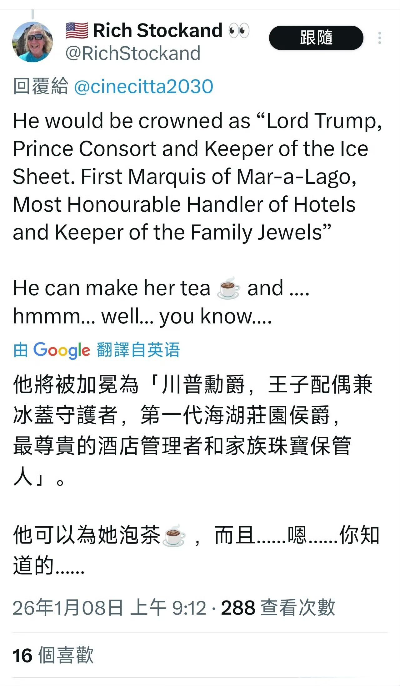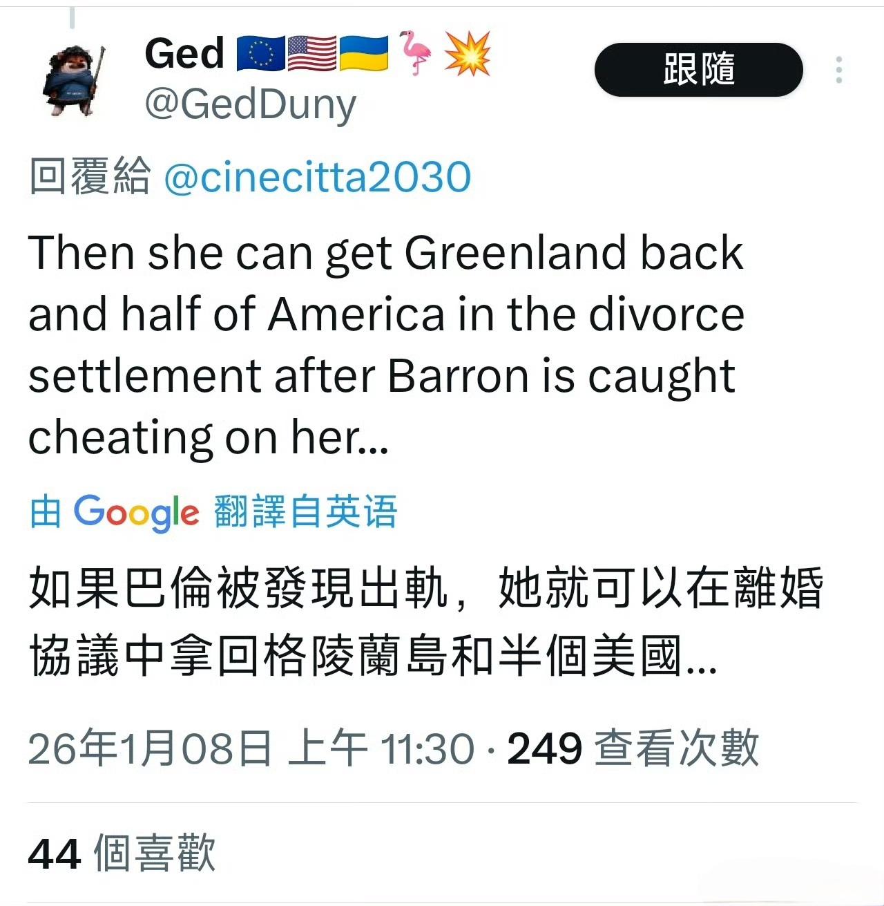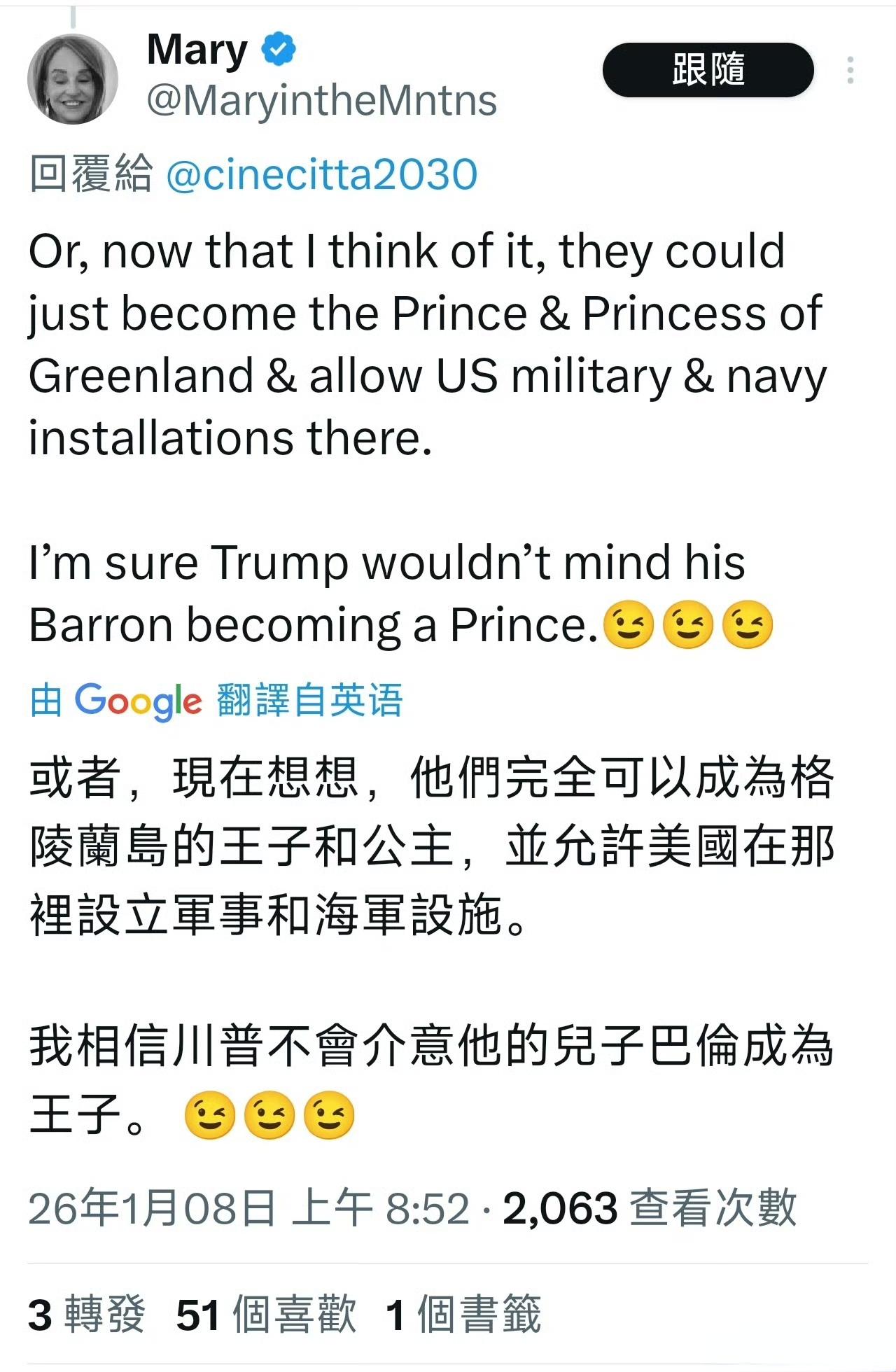 有人给特朗普出主意:让他的儿子巴伦娶丹麦伊莎贝拉公主,巴伦成为丹麦公爵,再由国王将格陵兰岛分封给他,这样格陵兰岛就归特朗普了。 巴伦19岁,伊莎贝拉18岁,两人年龄、身高、颜值、气质都很配。但有个问题,按照中世纪欧洲规矩,格陵兰岛会成为巴伦的个人领地,而非美国的领土。特朗普作为父亲能管理,但如果想要格陵兰归美国,可以让巴伦把岛屿卖给美国。