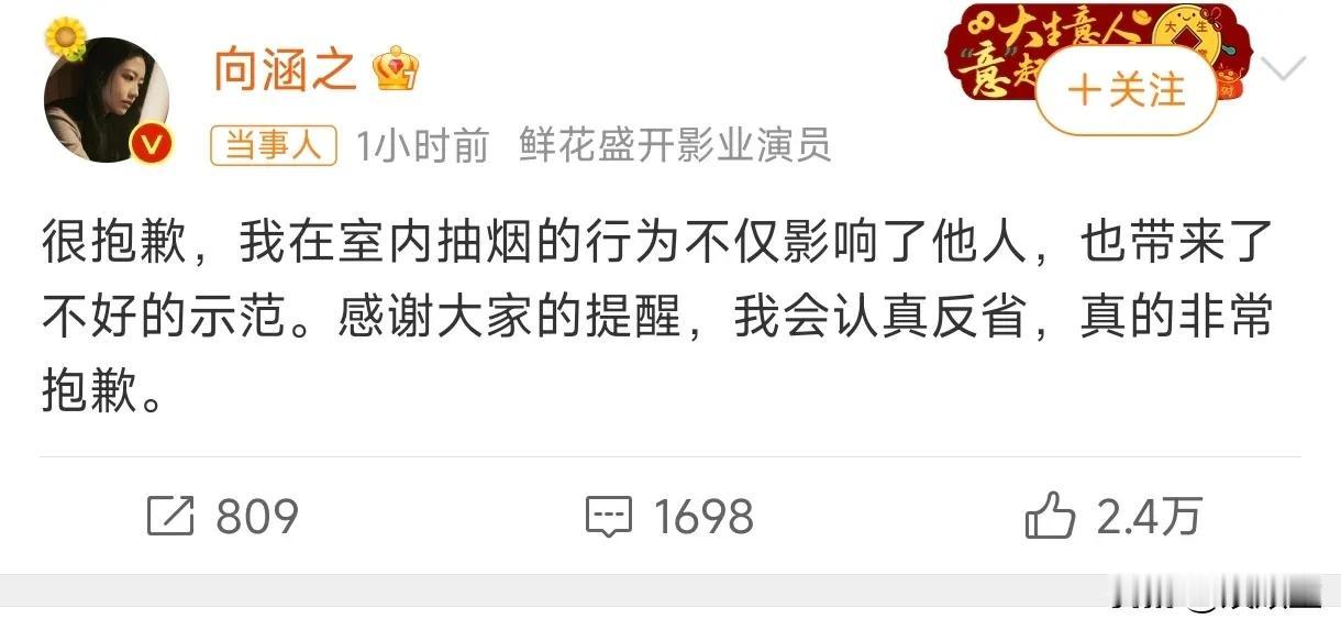 向涵之吞云吐雾这动作,烟龄应该不短! 事实也又一次证明,向涵之是一名好演员,她的作品、角色与个人形象还是差别挺大的! 相比恋情,向涵之应该是更注重吸烟这件事,前者没回应,后者第一时间道歉! 不过,大家并没有要求演员表里如一,所以对于向涵之吸烟这件事,大家给予理解,也没有过多的苛责!