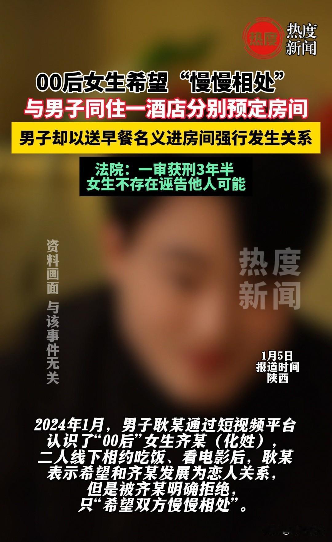 陕西,一00后女子,想和在网上认识的男子慢慢相处,可是对方等不及了。在女子前往辽宁沈阳参加面试时,男子悄悄尾随入住女子所在的酒店,借着给女子送早餐的机会进入了女子的房间,随后,不顾女子的强烈反抗,强行和她发生了关系。女子没有顾及两人曾经的朋友情分,直接报了警。男子一直辩称两人是恋人关系,但通过两人的聊天记录可以看出,女子一直拒绝,没有答应过对方要做他的女朋友。所以,在2026年1月,沈阳市沈北新区人民法院认定男子犯强奸罪,判处其有期徒刑三年六个月。 耿某看着身边的朋友都成双成对,出双入对的模样让他心里羡慕不已,也生出了浓浓的焦虑。 他托了身边不少人帮忙介绍对象,可大家都只是嘴上应和,没有一个人真的放在心上,更别说给他牵线搭桥了。 几番折腾下来,耿某没了办法,只能孤注一掷,打算在网上碰碰运气,说不定能遇到合眼缘的人。 缘分竟真的来了。耿某在网上闲逛时,遇到了00后女子齐某,两人加了联系方式后聊得格外投机,从兴趣爱好到生活琐事总有说不完的话,一来二去竟像是久别重逢的老友。 聊了一段时间,耿某主动邀约齐某见面看电影,齐某没有拒绝。 在耿某看来,这次见面是拉近关系的绝佳机会,他心里盘算着:一定要直接捅破窗户纸确定恋爱关系,要是一直唯唯诺诺,齐某说不定只把自己当成吃饭搭子。 见面时,耿某开门见山表达了心意,希望和齐某发展成恋人。 可齐某性格传统谨慎,虽对耿某有好感,却觉得相识时间太短,想再观察观察彼此是否合适。 耿某笃定齐某对自己有好感,却不愿慢慢磨合,只想让她立刻认自己这个男朋友,还想发展成实质关系。 齐某心里却很清醒:自己年纪小、社会经历少,不能因一顿饭一场电影就轻易托付自己。 无论耿某怎么软磨硬泡,齐某都没有松口,反而刻意和他保持了距离。 耿某有些着急,本以为能顺利确定关系,没想到两人的距离反而拉远了。 但他没有泄气,依旧每天发消息问候关心,还时不时寄小礼物。 齐某见他这般坚持,渐渐放下防备,不再刻意疏远,有心事和动向都会主动和他分享——她并非不认可耿某,只是想拉长恋爱前期的考察时间,把对方看清楚。 可耿某心里始终藏着邪念,他觉得只要没和齐某真正在一起,这段关系就没有掌控感,总想捅破最后一层窗户纸。 某天,齐某随口提起要去外地参加面试,还说了入住的酒店名字,耿某瞬间觉得这是把齐某变成“自己人”的绝佳时机,一个阴暗的念头在他心里滋生。 齐某前脚入住酒店,耿某后脚就订了同一家酒店的房间,就在齐某隔壁。 他没告诉齐某自己也来了,反而像平常一样发消息让她别紧张,言语间满是温柔。 夜里,耿某在房间里彻夜难眠,心心念念的齐某就在隔壁,他翻来覆去琢磨着,要找个浪漫又巧妙的方式让齐某接受自己。 第二天清晨,耿某给齐某发消息:“我给你带了早餐,开门拿一下。”齐某以为是他点的外卖,又惊喜又激动,急忙跑去开门。 看到门口的耿某时,齐某不仅没失落,反而很感动,觉得他特意赶来陪自己面试、送早餐,实在有心。 齐某笑着将耿某迎进房间,转身去拿餐具的瞬间,耿某悄悄靠近她,眼神里褪去温柔,染上了一丝邪气。 齐某瞬间察觉不对,后背冒起冷汗,急忙让他出去。 可耿某早已压抑不住邪念,一把抓住她的手腕,不顾她的挣扎和呵斥,强行与她发生了关系。 事情发生后,齐某瘫坐在地痛哭流涕,怎么也没想到耿某会做出这样的事。 她缩在被窝里不肯出来,委屈和绝望几乎将她淹没。 耿某却还在辩解,说自己是太喜欢她才一时冲动,还不停安慰、承诺会补偿。 可齐某那颗传统的心,早已被耿某的鲁莽卑劣击碎,她心中神圣的爱情也被玷污。 冷静后,齐某擦干眼泪,颤抖着拨通了报警电话。 警方接到报案后迅速调查,于2024年3月5日将耿某抓获。 被抓后,耿某仍极力狡辩,声称两人是恋人关系,是两情相悦。 接下来的近两年里,齐某一次次配合警方调查,提供聊天记录、酒店入住信息等关键证据,还要面对耿某一方的无理辩解。 她无数次深夜失眠,甚至因旁人的异样眼光自我怀疑,但一想到所受的委屈,就咬着牙坚持,心里告诉自己:“我没有错,一定要讨回公道。” 耿某在看守所里起初还抱有侥幸,以为拒不承认就能逃脱制裁。 可随着警方收集的证据越来越充分——聊天记录证明齐某一直拒绝发展实质关系,酒店监控佐证了耿某的行踪,他的辩解越来越苍白。 直到2026年1月,沈阳市沈北新区人民法院的一审判决下来了。 当法官宣读“被告人耿某犯强奸罪,判处有期徒刑三年六个月,被害人齐某不存在诬告他人的可能”时,齐某坐在原告席上,眼泪瞬间涌了出来。 她紧紧攥着判决书,两年的委屈、恐惧和坚持,终于有了结果。 《刑法》第236条,男子违背意愿强行发生了关系,就构成了强 奸 罪,判决合理合法。 对于此事,大家如何看? 素材来源于热度新闻2026.1.9