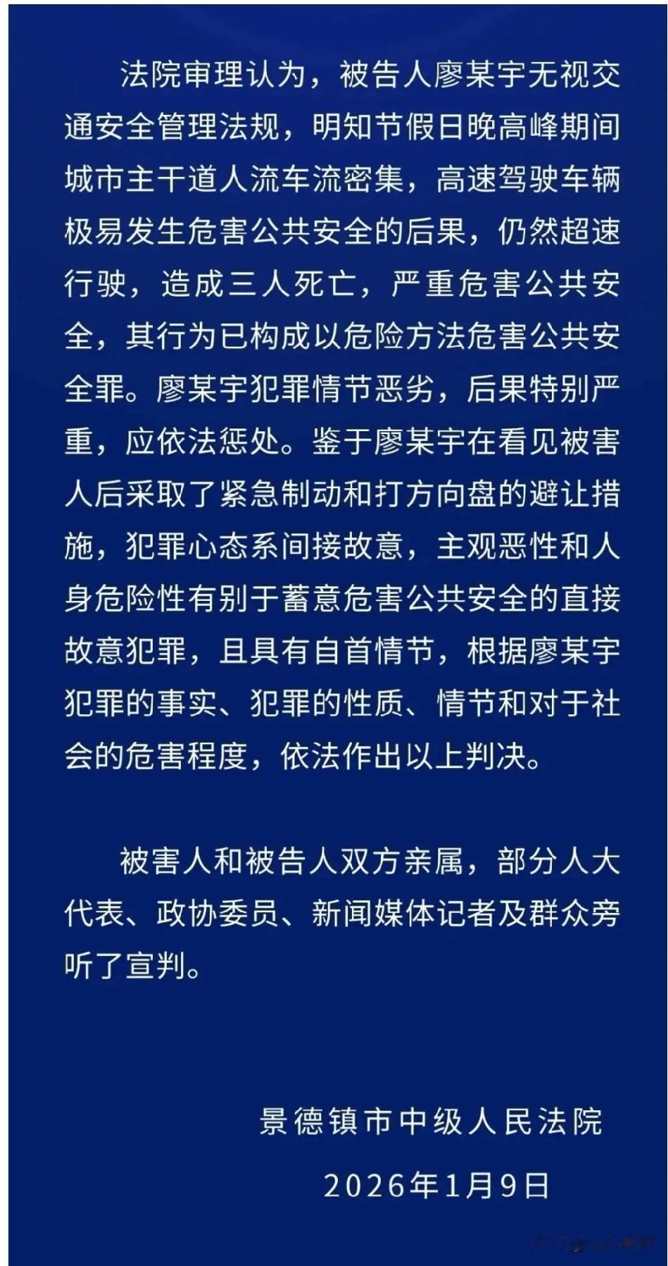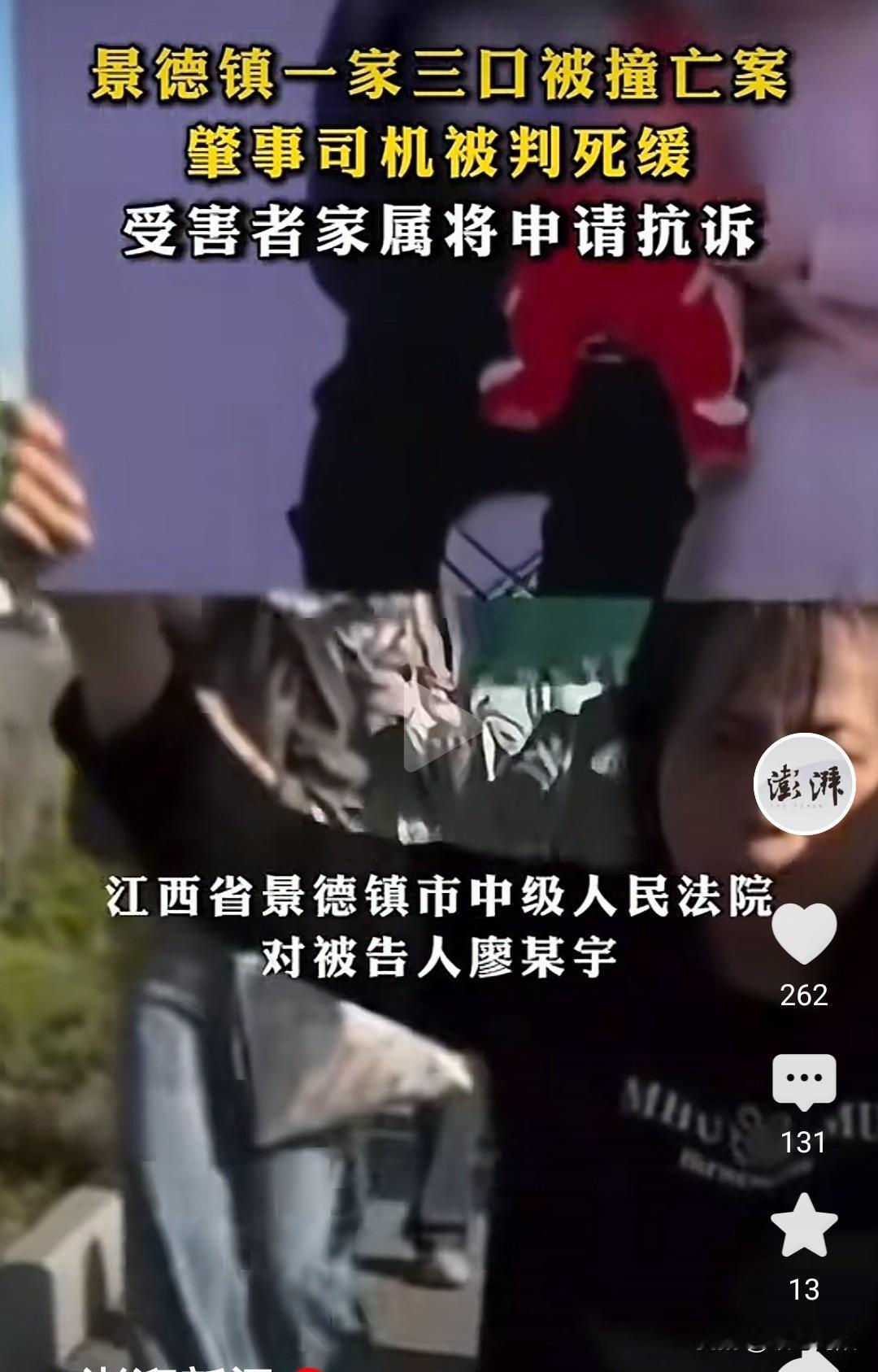 终于判了!江西景德镇撞死一家仨囗的男子廖某宇被判处死刑,缓期二年执行! 法院审理查明,廖某宇无视交通安全管理法规,在城市主干道限速路段高速骂驶车辆,造成仨人伤亡的事故,廖某宇犯罪情节恶劣,后果特别严重,应依法严惩。但是廖某宇在看见被害人时踩了刹车也打方向盘,只因车速太快,没有刹住车。而且双方并不认知,没有主观蓄意行为,并且主动报了警,也打120急救电话,有自首情节,所以判处死刑,缓期二年执行! 对于这个案件,从法条和法规看判的合情合理,但是给受害者家人造成了无法弥补的伤痛! 所以受害者父母将要申请抗诉!