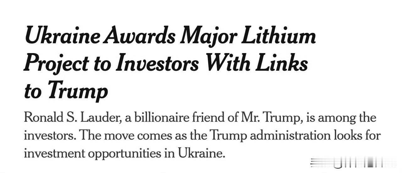 纽约时报援引消息人士的话称,乌克兰将基洛夫格勒州大型锂矿“多布拉”的开发权授予了特朗普的朋友。 竞标由一个财团赢得,其投资者包括亿万富翁罗纳德·劳德——这位化妆品帝国的继承人自学生时代就与特朗普相识,并曾向他提议购买格陵兰岛。另一个投资者是TechMet公司,这家能源公司部分归美国政府投资机构所有,该机构是在特朗普首个任期内成立的。 据《纽约时报》报道,该决定已获委员会批准,并将由内阁批准。两名委员会成员表示,此次竞标是公正的,获胜者满足了大部分竞标标准。 需要提醒的是,根据矿产协议,美国在参与乌克兰新项目时享有优先权。 俄乌战争