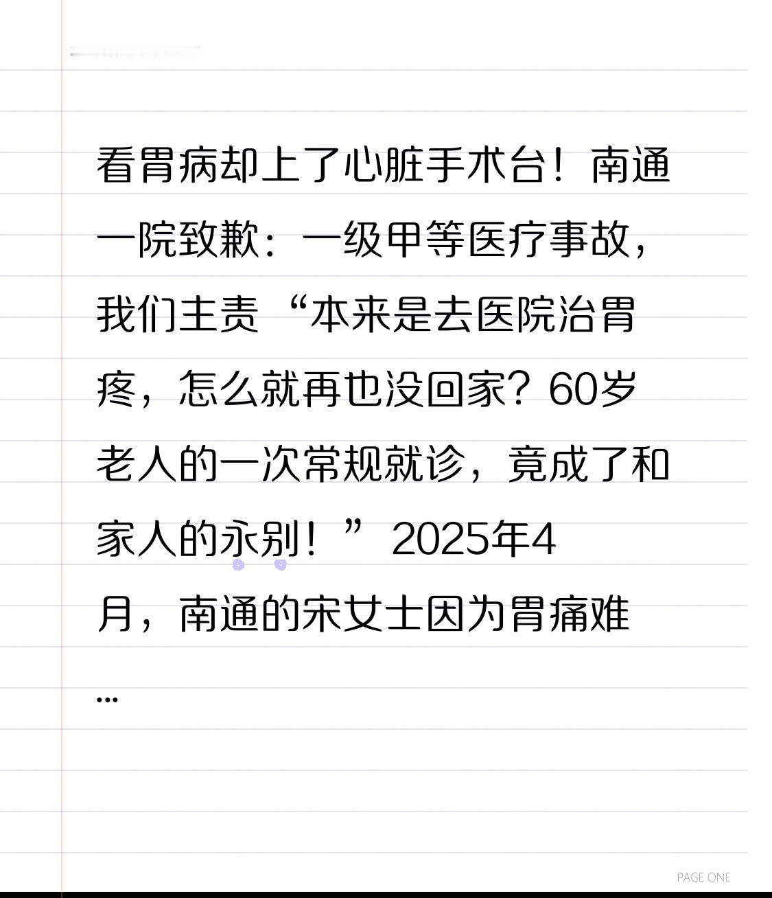 看胃病却上了心脏手术台!南通一院致歉:一级甲等医疗事故,我们主责 “本来是去医院治胃疼,怎么就再也没回家?60岁老人的一次常规就诊,竟成了和家人的永别!” 2025年4月,南通的宋女士因为胃痛难忍,走进了南通市第一人民医院消化内科。本想做个胃镜查清楚病因,可医生一句话让她慌了神:“你有心悸,不能全麻做胃镜,得先治心脏”。 家人一开始是犹豫的,专门咨询了外地专家,得到的答复是“心悸靠药物就能控制,没必要做手术”。可架不住医院反复劝说,说这是“微创低风险”的小手术,做完就能安心做胃镜。谁能想到,这个号称“安全”的心脏射频消融术,成了夺命的陷阱。 4月29日,宋女士被推进手术室,可手术中突发呼吸心跳骤停,经过两小时全力抢救,还是没能留住她的生命。好好的人上了手术台就没了,家属怎么也接受不了,他们仔细翻看病历,越看越心惊:医院不仅术前没做关键的冠状动脉造影检查,风险也没说清楚,甚至手术指征用的是一年前的旧数据,术前复查没发现早搏还强行手术,病历里还出现了无来源的虚假数据! 直到2026年1月9日,时隔9个月,南通市第一人民医院终于发布致歉声明。省市两级医疗事故鉴定早已明确:这是一级甲等医疗事故(患者死亡),医院因为风险沟通不到位、手术操作未尽谨慎义务,承担主要责任 。可这份迟到的道歉,却藏着争议——医院说家属提出的赔偿金额超出法律标准,双方多次协商没谈拢。 网友们彻底炸了:“看胃病被硬拉去做心脏手术,这不是草菅人命吗?”“道歉说得轻巧,一条人命怎么赔?”“医院多次卷入医疗纠纷,早该好好整改了” 。其实对家属来说,再多的钱也换不回亲人的生命,他们要的不过是一个公道,一份对生命的尊重。 医疗无小事,每一个诊疗决策都连着一条人命、一个家庭。医生的一句建议,可能是希望,也可能是深渊。这次悲剧也给所有人提了醒:就医时遇到非必要手术,一定要多问、多查、多咨询,别盲目相信“微创就没风险”。 医院的道歉是第一步,但更重要的是后续的整改和担当。希望这场悲剧能真正敲响警钟,让医疗机构把患者安全放在第一位,别再让“看病”变成“送命”。 如果你是家属,会接受这样的道歉吗?就医时你遇到过不合理的诊疗建议吗?评论区聊聊你的看法,也转给身边人,多一份警惕,少一份风险!