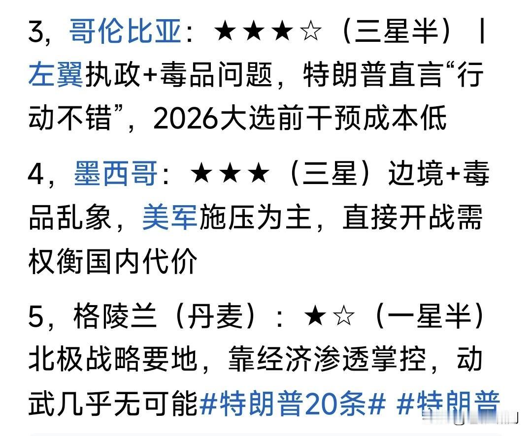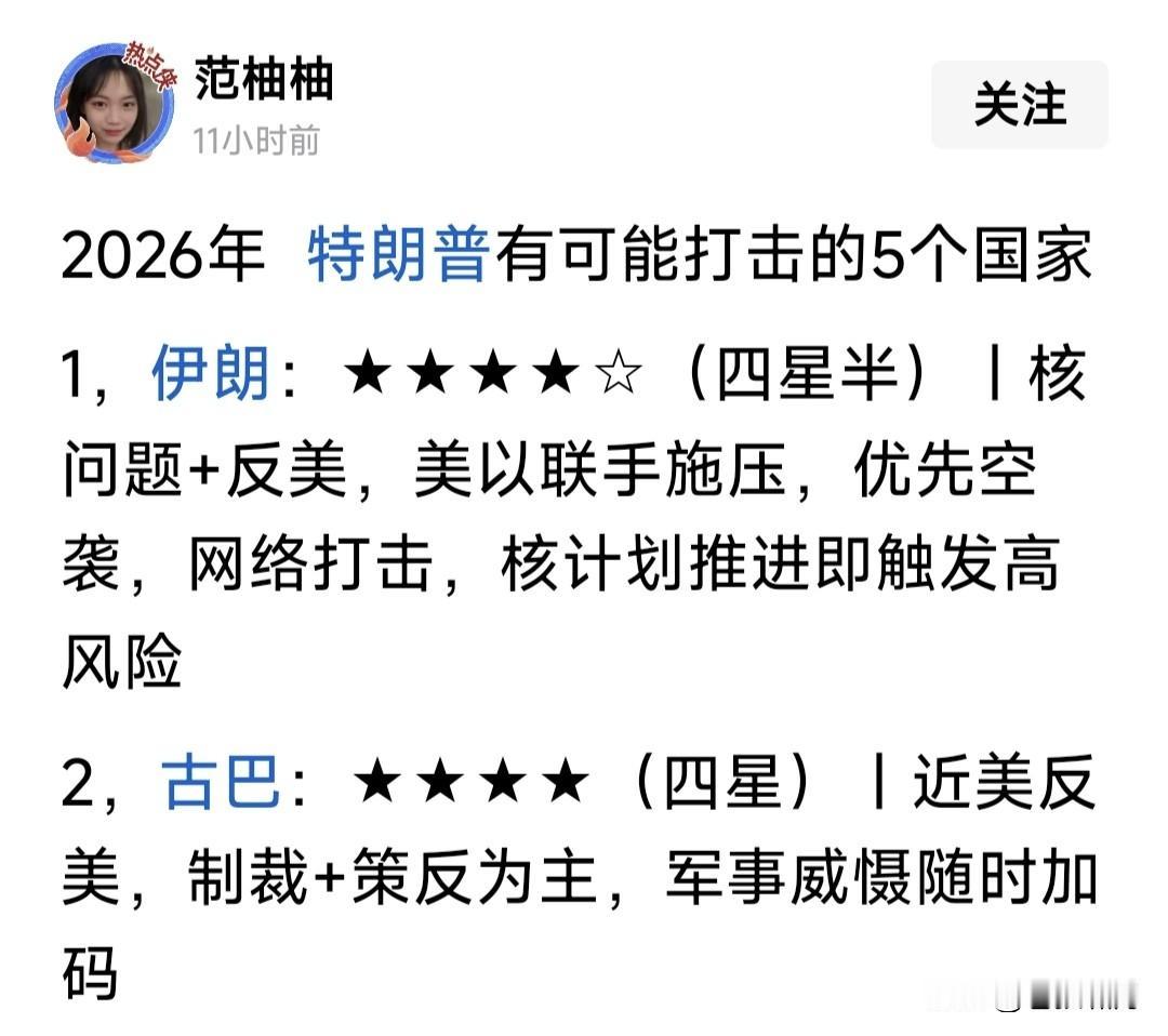 网友预测2026年,川普要打击的五个国家与地区!顺序分别是:伊朗古巴哥伦比亚,墨西哥与格陵兰! 苍狼觉得伊朗有可能!因为扳倒哈梅神权,中东再无反美国家。此前伊朗扶持的“哈真胡叙”,都不在话下。 古巴没可能!因古巴与委内瑞拉不同,突袭抓人难,登陆攻击难度大!老特要掂量后果,脱不了身怎么办? 哥伦比亚不会!佩德罗已向老特服软,电话解释本国禁毒与分歧,期望访美继续交流。抬手不打笑脸人! 墨西哥是邻居,动手弊多利少!如果发生战争,难民涌入咋办?铁丝网边境墙得住?不是自己找罪受吗? 格陵兰更不行!丹麦是北约国家,格陵兰是丹麦监管。美国会不许川普动武,欧洲支持格陵兰民众公决! 如此内外掣肘,老特岂敢肆意妄为?除非是想中期选举失败,自己遭遇弹劾,总统干了一半就半途而废? 最好选择是促成俄乌停战!既有面子又得里子,得到各方称道,巩固北约团结友谊。保证中期选举不败,总统干满四年,做更多事,何乐不为? …………