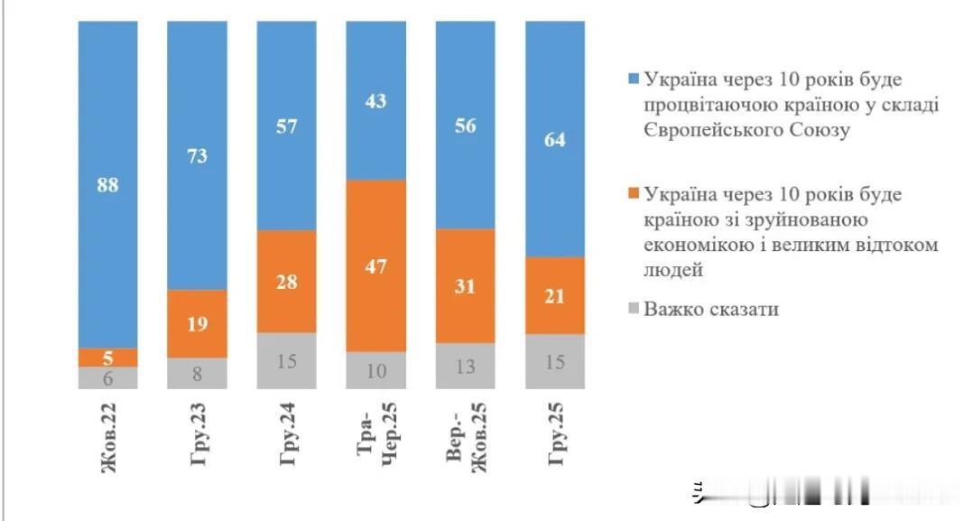 十年后,乌克兰将成为繁荣的欧盟成员国:调查显示的结果是什么 大多数乌克兰人相信,十年后,乌克兰将成为欧盟中,一个繁荣的国家。这一点,从2025年底进行的全乌克兰KIIS调查显示了这样的结果。乐观情绪不仅从下跌中恢复,还超过了去年的指标。 2025年12月初,进行了一项全乌克兰民意“综合”调查。报告由基辅国际社会学研究所(KIIS)发布。 大多数乌克兰人对未来充满乐观: 根据KIIS的数据,2025年12月,64%的受访者认为,10年后,乌克兰将成为繁荣的欧盟成员国。相比之下,只有21%的受访者坚信,乌克兰的未来与经济崩溃和人口外流有关。社会学家指出,这些指标表明,在2025年上半年,经历一段悲观情绪的加剧后,积极预期的恢复。 2025年情绪的变化: 从2022年10月到2025年5月,乌克兰的乐观情绪持续下降。2025年5月,悲观估测,首次占上风:47%对43%。 然而,早在2025年下半年,情况就发生了巨大变化。乐观者比例,在十月上升至56%,年底达到64%,而悲观者比例则超过一半。 谁最相信乌克兰的欧洲未来? 乌克兰人乐观度更高,以下群体: 信任乌克兰总统(74%的乐观者); 对照反腐败斗争的真实变化(75%); 将欧洲视为乌克兰可靠的盟友(73%)。 在区域和社会人口背景下,这种差异并不致命:在所有群体中,大多数受访者都认为,乌克兰是未来的欧盟成员。 年轻人也乐观: 在18至29岁的乌克兰人中,64%坚信乌克兰将在十年后,成为一个繁荣的欧洲国家。社会学家强调,鉴于乌克兰的人口和移民前景,这一比例尤为重要。 继续抵抗的意愿: 研究还显示,未来愿景与对战争的态度之间存在直接关系。乐观者中有68%表示,愿意忍受战争直到战争结束。悲观者中有51%也是这样表示。同时,即使在悲观派中,大多数受访者也拒绝采纳俄罗斯“和平计划”的可能性。 社会学家结论: KIIS强调,关于“乌克兰绝望未来”的叙事是危险且令人沮丧的。同时,2025年下半年,乐观情绪的增长表明社会正在适应新现实,并保持对国家欧洲进程的信心,尽管面临战争和外部挑战。