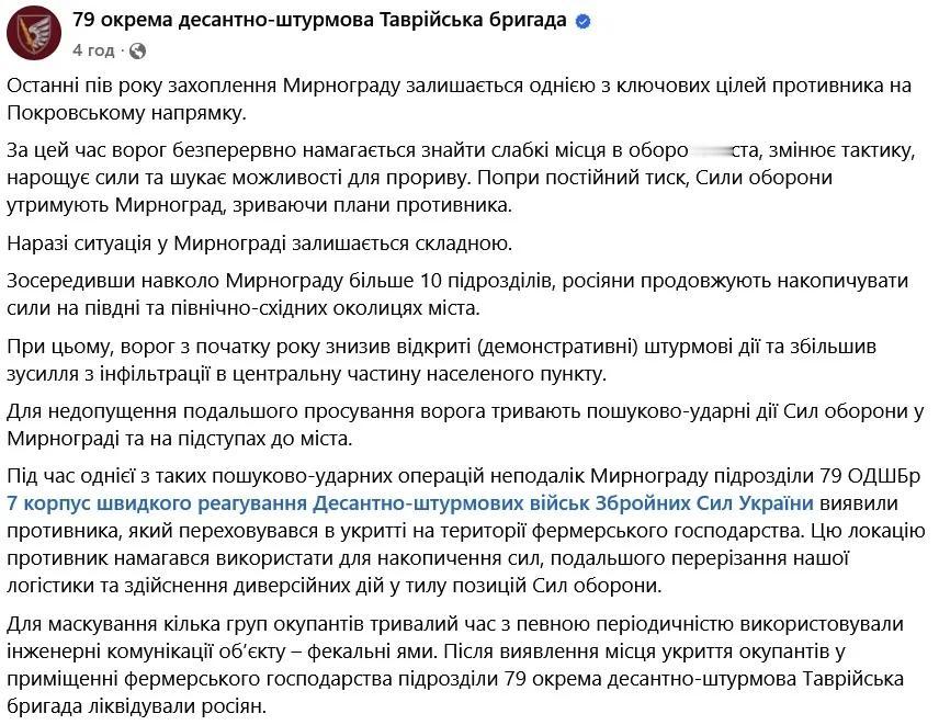 在波克罗夫斯克方向,乌克兰伞兵挫败了俄军在米尔诺赫拉德附近秘密集结兵力的企图。俄军在农场的接盘上搭建了避难所,甚至用粪坑作为伪装。乌克兰防卫部队的搜索和打击行动以消灭敌人而结束。这一消息由第79独立空降突击塔夫里亚旅在其Facebook页面上报道。