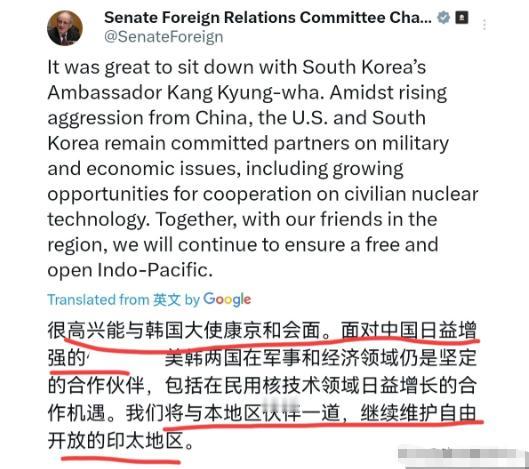美国开始敲打李在明了!李在明访华行程刚一结束,美国参议院外交关系委员会主席吉姆·里施就约见韩国驻美大使康京和,其表态对我们非常不友好!1月8日,吉姆·里施刊文表示,很高兴能与韩国大使康京和会面。此人声称,面对中国日益增强的“侵略性”,美韩两国在军事和经济领域仍是坚定的合作伙伴,包括在民用核技术领域日益增长的合作机遇。 就在李在明结束访华行程的前脚刚迈出北京,大洋彼岸的华盛顿立刻就有了动作,这场看似普通的外交接触,实则充满了某种耐人寻味的“问责”意味,就在1月8日,那个经常在国会山对着地缘政治指手画脚的参议院外交关系委员会主席吉姆·里施,大张旗鼓地把韩国驻美大使康京和叫到了跟前。 里施这番“约谈”的时间点选得不仅是“卡点”精准,简直可以说是刻意为之,面上看他是在这一天刊文表达“很高兴会面”,嘴里挂着美韩是“军事和经济领域的坚定伙伴”,但紧接着抛出的却是对中国日益增强所谓“侵略性”的指责。 这就把这场会面的底色彻底暴露了,里施提到的那个“民用核技术合作机遇”,听起来像是个礼包,实际上更像是一份还没寄出的天价账单,甚至是一道隐形的经济枷锁。 说到这个核技术合作,韩国人心里恐怕是五味杂陈,甚至可以说是一道碰不得的伤疤,美国人嘴里的“机遇”,在韩国业界的账本上,从来都是必须要吞下的苦果。 回顾过往,当韩国水力原子能公司被迫与美国西屋电气签下那份备受争议的协议时,很多韩国业内人士只能打碎牙往肚子里咽,协议内容苛刻到什么程度?每卖出去一座核电机组,且不说6.5亿美元的设备和劳务费要拱手让人,光是纯粹的“技术使用费”就要上贡1.75亿美元。而且这一交就得是50年起步。 更狠的是,这种技术霸权是渗透进骨子里的,哪怕后来韩国工程师争气,自己搞出了小型模块化反应堆,按规矩还是得乖乖送去让西屋电气搞“技术验证”,这就难怪当时这事在韩国国会被痛批是“卖国协议”,甚至直接把相关的核电股吓得大跌,现在里施又把这事拎出来说,无非是想提醒对面的康京和:不管你们想怎么在大国之间搞平衡,吃饭的碗和做饭的锅,还在美国手里攥着呢。 在这场外交施压的背后,美国人手里握着的除了“经济账本”,还有实打实的“军事大棒”,而且挥舞得越来越随心所欲。 对于这一点,康京和这种在联合国历练过的多边外交老手恐怕也深感无力,想当年她跟那个满嘴火药味的蓬佩奥打交道时,就没少挨近乎羞辱的指责,以至于后来能跟稍微讲点体面的布林肯通电话时,都不由得感慨“要是早点碰到你就好了”,但不管对面坐的是谁,美国要的不是韩国的外交辞令,而是绝对服从。 这种服从是有代价的,甚至是带有羞辱性的单方面行动,就在去年年底,完全没有经过什么像样的协商,驻韩美军平泽基地的一整支精锐,第5-17空中中队,突然就被美国人宣布整建制撤离了。 这可不是小动静,这支部队那是配着AH-64E“阿帕奇”武装直升机和RQ-7B无人机的一线战力,500多号人,是地面作战的关键支援力量,关键是,这支部队2022年才刚部署到位,连热乎气还没喘匀,不到三年就撤编。 韩国国防部那边只能尴尬地解释说是美军“自身转型”,但也只能唯唯诺诺地承认事前根本没被充分告知,说撤就撤,这就是赤裸裸地告诉首尔:你们的安全伞,美国人想开就开,想收就收。 这其实就是美国长期以来对待韩国盟友的真实嘴脸:要钱要权还要命,早些时候,华盛顿甚至狮子大开口,逼着韩国把国防预算在GDP里的占比直接拉升到5%,这种要求简直到了荒唐的地步。 更别提在驻韩美军分摊费用的问题上,美国曾试图把价码从11.34亿美元这种规模,一口气暴涨到100亿美元,吃相之难看,连一向能忍的韩国人都只能拿“协议未到期”来硬顶回去。 现在美国人又急着给这个同盟条约打补丁,里施在会面中刻意强调所谓的“印太地区”,其实是在给《美韩共同防御条约》做扩大化解释的铺垫,他们的算盘打得很响:就是想把韩国死死绑在美国的战车上,不仅要管朝鲜半岛的事,未来一旦“台湾有事”,韩国也得作为马前卒顶上去,这跟李在明现在极力想要推行的“自主国防”理念,根本就是南辕北辙。 里施拿中国当幌子,大谈特谈所谓的“侵略性”,不过是给这种深度控制找个道德借口罢了,美国真正焦虑的是,如果李在明真的在北京找到了某种战略回旋的空间,那个把韩国当作东亚战略桥头堡、甚至反华前哨站的布局就会出现裂痕。 日本那边好不容易拉起来的印太“小多边联盟”也会因为韩国的松动而缺角,所以哪怕李在明刚下了飞机,这边的敲打就必须得跟上,用核能合作当诱饵,用军事撤军做威慑,用外交召见来定调,这一套组合拳下来,就是要逼着韩国在夹缝中别无选择,只能回头。 但在经历了这么多“霸凌式”盟友待遇后,韩国这回究竟是忍气吞声,还是能在这种极限拉扯中挤出一点独立空间,才是这场博弈最精彩的看点。