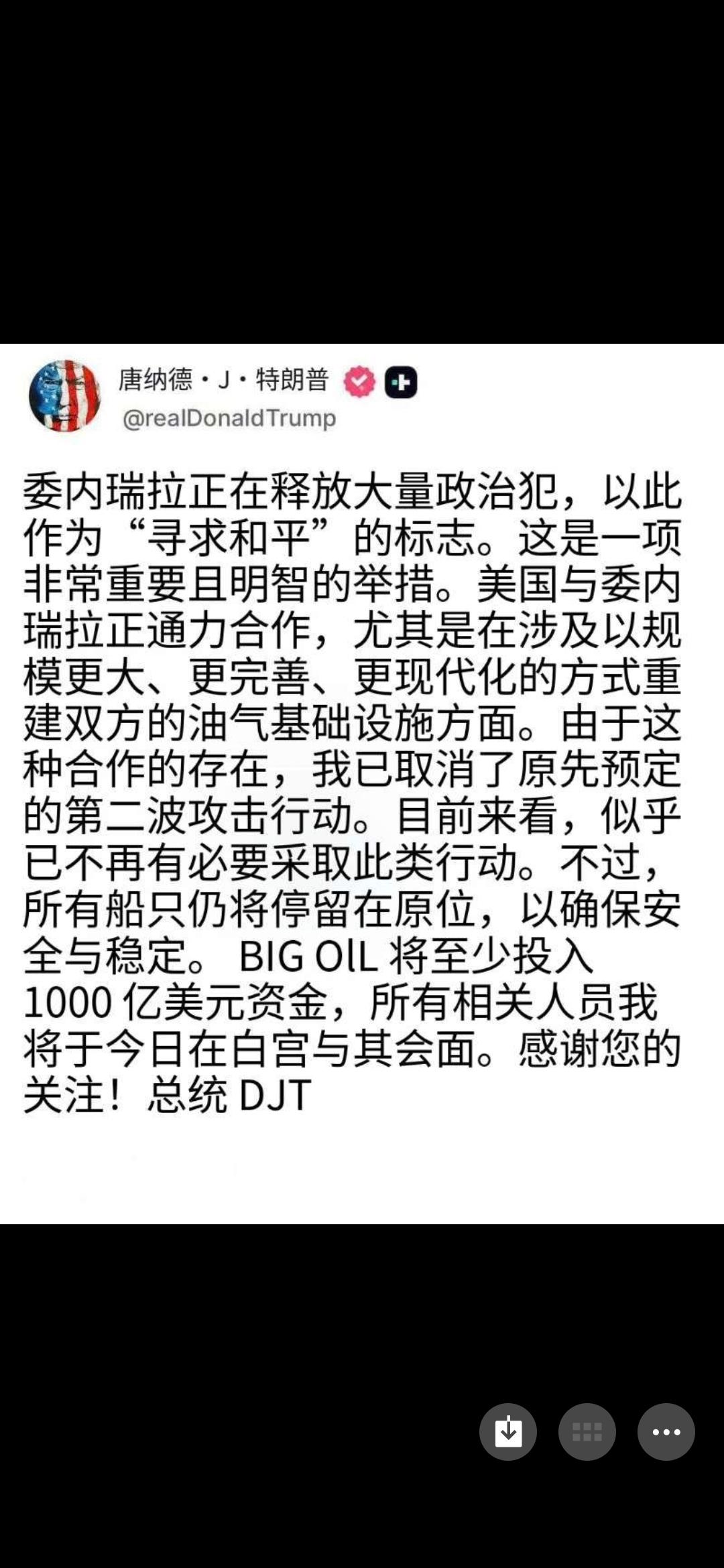 特朗普刚刚(1月9日)在“真实社交”平台发文,直接说:“我已经取消了原先预定的对委内瑞拉的第二波攻击性动”,之所以如此,按照特朗普自己的说法,是因为现在委内瑞拉正在释放大量政治犯,正在与美国进行通力的合作。 不过,可以看出,特朗普这个发言,其实是在给自己找一个台阶下。首先,委内瑞拉国内,现在并没有与美国进行所谓的“通力合作”,前不久委内瑞拉的外长还在感谢我们的仗义执言,委内瑞拉国内,更是已经通过法令,在全国范围内抓捕亲美内鬼。这一切,都不是什么和美国“通力合作”的现象,反而是表现出了坚定抗争美国野蛮行为的决心。 特朗普之所以如此说,还是自己怂了。这一次抓捕马杜罗的行动,其实很鲁莽,美国自己国内的石油巨头,都不支持这一项行动,同时对委内瑞拉的石油也没有任何兴趣,原因很简单,石油行业是一项重资产产业,如果这些石油巨头真想要开采委内瑞拉的石油,前期投资就要几百亿美元,这么多钱,什么时候才能赚回来?因此,没有一个石油巨头感兴趣。 特朗普这一次针对委内瑞拉,最大目标是其石油,可是美国国内的石油巨头却不配合,他这一最大目标,直接落了空。 而委内瑞拉也没有如同特朗普预料的那样直接屈服,反而展现出坚定抗争美国野蛮行为的决心和斗志。 如果继续下去,那么真就不好收场了。 所以,特朗普终于还是跟之前的多次行动一样,虎头蛇尾,炮制了一个大新闻之后,转而准备去炮制另一个大新闻了。