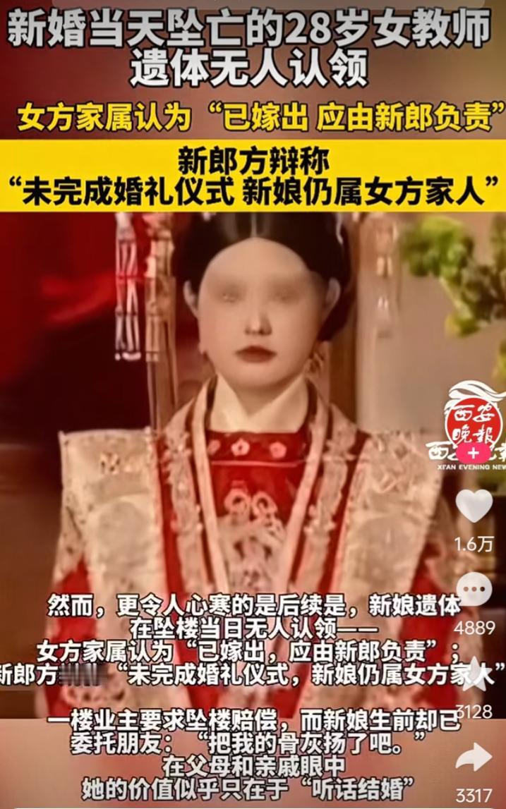 悲剧啊,新婚当天跳楼身亡 河南女教师新婚当天跳楼身亡,这一突如其来的悲剧再次引发了社会的广泛关注与深思。在这个本应充满喜悦和希望的日子里,为什么会发生如此令人心碎的事情?有人说,生活的压力、家庭的责任、事业的焦虑,让她在幸福的表面下隐藏了太多无法言说的痛苦。而更多的人则开始反思:我们是否忽略了身边那些在微笑背后承受巨大压力的人? 这个故事,像极了许多普通人的缩影。她,也许曾经阳光灿烂、充满梦想,但现实的重压、社会的期待,逐渐让她变得沉重。有人会说,年轻的生命如此宝贵,怎么能就这样轻易放弃?但我们是否也曾在生活的某个角落,感受到那份无助与绝望?在我们忙碌奔波的同时,有没有静下心来,关心一下身边的亲人、朋友,是否也在默默承受着看不见的痛? 这起悲剧的背后,折射出的是社会对个人心理健康的忽视。 我们常常把焦点放在表面的幸福和成功,却忽略了那些隐藏在心底的阴影。特别是在婚姻、家庭、职业压力叠加的时代,许多人都像她一样,站在了崩溃的边缘。她的选择,让我们不得不面对一个残酷的现实:心理健康,已经成为现代社会亟需重视的“隐形疾病”。 更令人扼腕的是,公众的关注和救助机制似乎还不够完善。有人在社交平台上表达了惋惜和哀悼,也有人开始反思:我们是否可以做得更多?比如,建立更全面的心理健康支持体系,让每一个在黑暗中挣扎的人都能感受到温暖和希望。毕竟,生命如此脆弱,也如此宝贵,没有任何压力值得用生命来抗争。 这起事件,也让我们重新审视了“幸福”的定义。也许,幸福不只是表面的光鲜亮丽,更是内心的平静与满足。 我们每个人都可能在生活中遇到低谷,但关键在于:我们是否愿意伸出援手,是否愿意关注那些在暗夜中孤独挣扎的人。因为,只有当我们学会倾听、关心和理解,才能让这个社会变得更加温暖。 这不是一场简单的悲剧,而是一面镜子,照出了我们每个人的责任。我们不能改变过去,但可以从现在开始,关注身边的每一个人,给予他们更多的理解和支持。让我们用行动传递正能量,让生命的价值不再被忽视。希望未来,不再有这样的悲剧发生,因为我们都愿意成为那个点亮他人生命的光。新婚坠楼