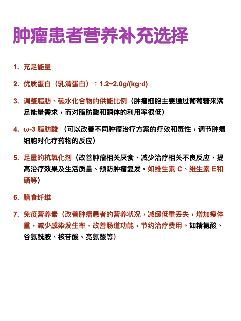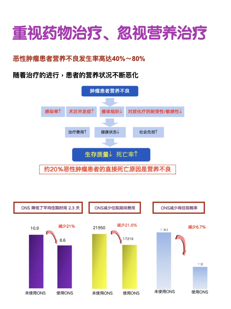 2022年我国新发恶性肿瘤病例482.47万,其中男性世标发病率高于女性,肺癌还是遥遥领先,是不是因为男性吸烟多?! 我国总人口占全世界的18.8%(不足1/5),但是新发肿瘤患者占全世界的23.7%(超过1/5),肿瘤死亡人数占全世界肿瘤死亡的30%(超过1/4),五年生存率不及发达国家的一半。 我国在肿瘤治疗方面与发达国家的差距不是手术、不是放化疗、更不是靶向治疗或生物治疗,而是以营养为主的支持治疗。 肿瘤患者需要: 1. 更高的能量(非常消耗,而且放化疗也会影响正常细胞对营养的吸收) 2. 优质蛋白质(更好吸收和利用),在临床经常看到肿瘤患者买大豆蛋白粉的 3. 降低碳水比例,增加脂肪的比例 4. 足量的抗氧化剂、膳食纤维、免疫营养素 所以肿瘤患者加餐很重要,选对营养补充剂很关键! 最好从确诊的时候就开始补充,预防营养不良 开始手术、放化疗后,可以根据摄入情况补充2-4次 对于完全吃不了的人群,应该以口服营养补充为主 建议到临床营养科接受指导!