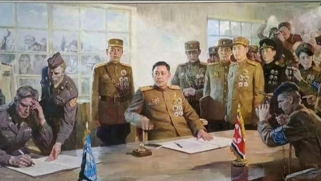 板门店谈判本就是朝鲜南日大将为首谈判的,朝鲜三人中方两个,幕后还有谍王李克农。板门店签字是南日大将签的,随后拿到后方彭德怀代表中国志愿军签字,金日成代表朝鲜签字。这幅图本就是针对美韩的政治宣传画,没什么大不了的