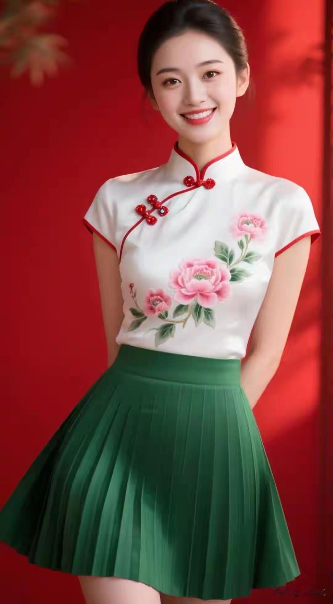 出水芙蓉,亭亭玉立 明眸皓齿,面若冠玉 中式无袖,绿色裙子 花容月貌 ,梨花带雨 天生丽质,国色天香 纤腰楚楚随风摆, 丽影翩翩入梦来。 玉颜如莲初绽放, 不染尘世半分埃。