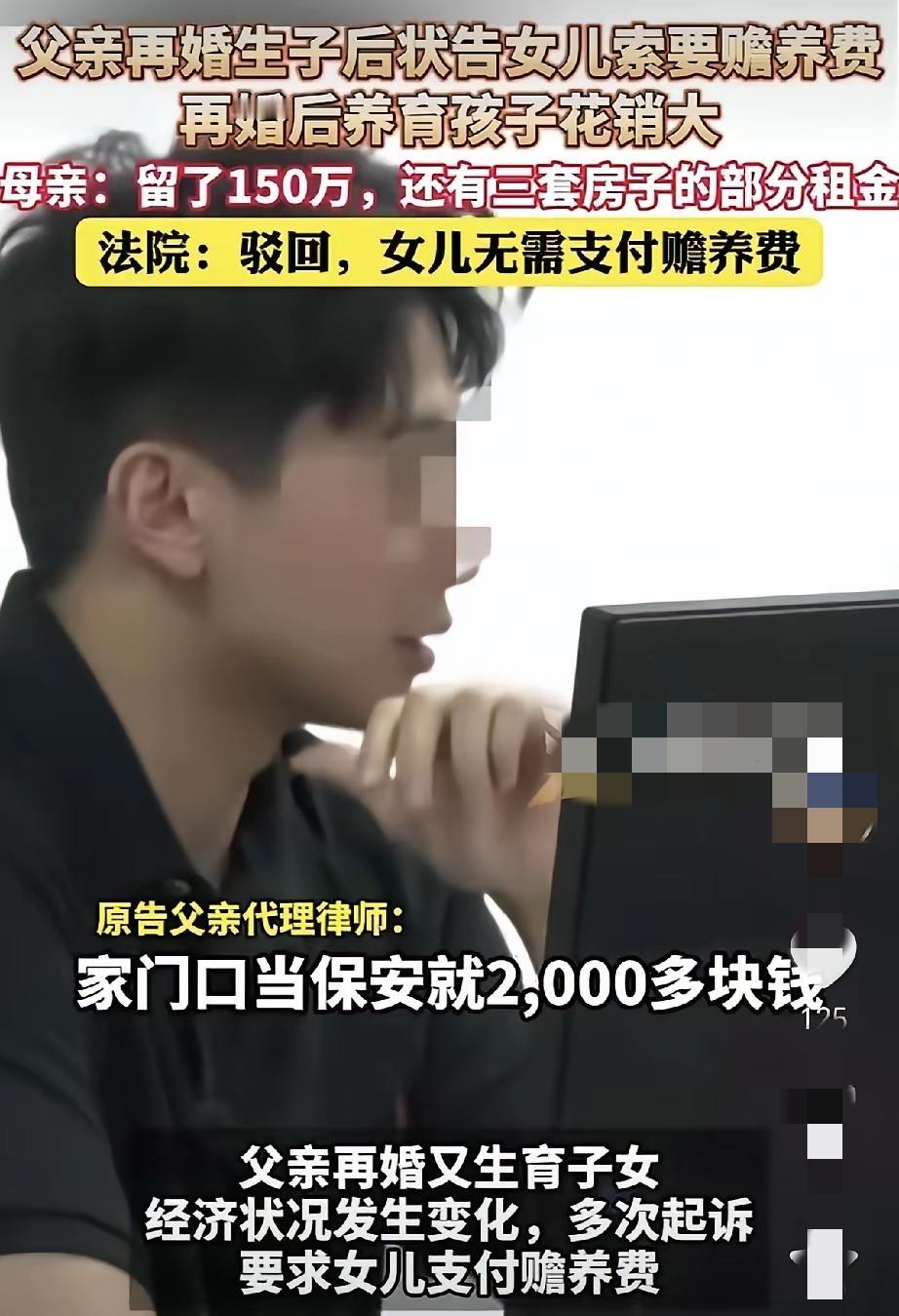 想钱想疯了!北京,一男子离婚,分到150万元财产,还有三套房子出租,每套租金4900元,男子耐不住寂寞,又再婚生子,为了养活孩子,他去当了保安,工资每月2000元,他觉得工资太少,养活不了一家三口,男子眼珠一转,直接把前妻女儿告到了法院,要女儿每月支付他赡养费5000元,前妻要求查账,法院一查,他账上没钱,150万元早就提现,前妻不愿意了,三套房租养他足够,老婆孩子是他自己的义务,法院判了! 这算盘打得,隔着屏幕都能听见响!三套房子每月租金4900×3=14700元,加上保安工资2000元,月入近17000元,这水平在北京都够体面生活了,居然喊穷? 150万巨款早早就悄悄提现,既拿不出合理花销证明,又说不出钱的去向。说白了,就是不想用自己的钱养现任妻儿,转头就想薅前婚女儿的羊毛! 《民法典》1067条说得清清楚楚,子女赡养父母的核心前提,是父母“缺乏劳动能力或生活困难” 。他身强体健能当保安,收入远超基本生活线,哪沾得上“困难”的边? 前妻的反驳太戳心了!老婆是他自己选的,孩子是他自己要的,这份抚养义务本该他自己扛,凭啥甩给毫无过错的女儿?女儿说不定也在为房贷、生计打拼,凭什么要为他的选择买单? 北京类似案例早有判决,只要父母有稳定收入、不满足赡养法定条件,法院都会驳回无理诉求。赡养是底线,但绝不是父母转嫁责任的“提款机”! 换做是你,遇到这样只想压榨女儿的父亲,能接受吗?赡养该尽,但得明明白白、合情合法,不能让孝心被当成理所当然的索取! 各位读者你们怎么看?欢迎在评论区讨论。